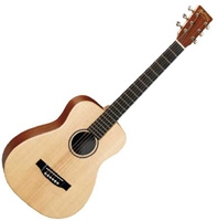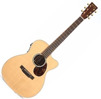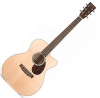 Guitare Martin Special Editions Ellipse. 14 cases pan coupé. Table épicéa sitka massif. Rosace avec motifs palissandre indien, érable et koa. Dos et éclisses HPL satiné fauve. Tête idem avec logo noir...