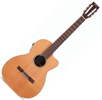Forme 000 avec pan coupé éléctro acoustique. Table épicéa massif brillante. Dos et éclisses palissandre indien satiné. Rosace herringbone. Manche cèdre Espagnol. Touche et chevalet micarta noir. Plaqu...