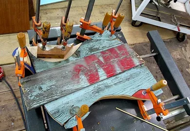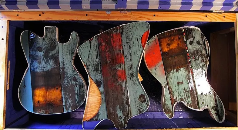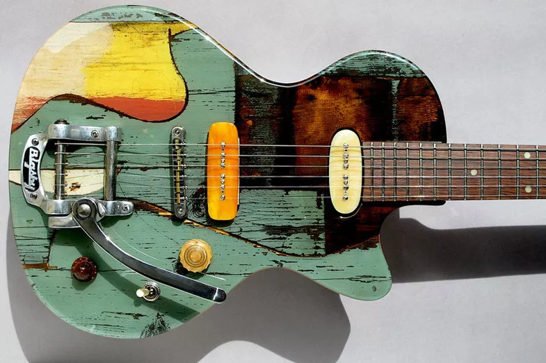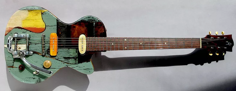 L'année dernière déjà, il nous avait ébloui à Montréal avec un modèle réalisé avec son compère et luthier Andreas Neubauer, la VGC n ° 1. Cette année, sa nouvelle idée vient d'une porte, celle de son nouvel atelier à Vienne qu'il a décidé de changer. Son intention, utiliser les planches de pin de cette porte pour réaliser une série limitée de 50 guitares. Ces planches sont bien sûr destinées à la table d'une solidbody et pas à autre chose. Regardez le résultat et jugez par vous même. C'est une histoire de goût et me concernant, je trouve au final que le visuel est hallucinant, avec des couleurs et des constrastes que j'apprécie en général sur des tableaux de peintres impressionnistes. De forme LesPaul, le corps est en acajou recouvert de planches de pin de la dite porte. Le manche est en acajou avec une touche palissandre. Le diapason est de 25 1/2". Bigsby vibrato, Gotho ABR bridge, Gotho vintage style tuners. BoneTop P-90 style pickups.