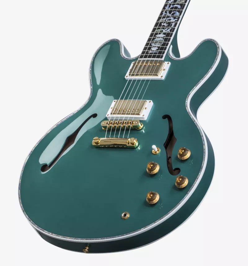 Autant vous prévenir d'entrée de jeu, les modèles Gibson Custom que nous allons voir ensemble ci-dessous ne sont pas à la portée de toutes les bourses mais la bonne nouvelle c'est que le lèche vitrine, c'est gratuit alors profitons-en ! Et pour commencer quoi de mieux que la Les Paul et l'ES-335 Ultima annoncées chacunes à $7999 et qui reçoivent sur la touche en ébène un arbre de vie incrusté fait de nacre et d'abalone également utilisé pour le filet de la table, les incrustations de la tête et les bouton des mécaniques Grover Imperials. L'accastillage doré complète le tableau de ces superbes guitares équipées de micros Gibson 57 Classic.
