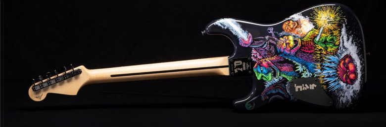 Pour les fans les plus riches du Roi des Monstres, il y a la Masterbuilt Godzilla Stratocaster, fabriquée par Andy Hicks. Il s'agit d'une Strat hardtail relativement simple avec un unique humbucker Sonic Pickups The Cult Leader, un modèle japonais à fort niveau de sortie. Le bouton vert ressemblant à un killswitch active en fait un cri de Godzilla, de quoi pimenter n'importe quelle jam ! On n'est pas loin des jouets pour enfants, mais à un prix légèrement différent. Pour le look, Hicks a fait appel à l'artiste Tom Neely qui a conçu un superbe Godzilla noir et blanc et face avant dont le souffle glacé bleu clair est assorti à l'incrustation de touche. À l'arrière, une fresque mêlant six versions différentes du kaiju a été réalisée à la peinture néon et brille donc à la lumière noire. Un objet d'art autant qu'une guitare donc.