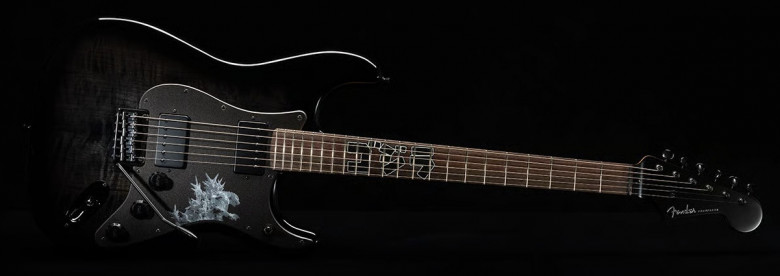 Les deux modèles Made In Japan sont en théorie réservés au marché japonais, mais nous ne sommes pas à l'abri d'en voir venir certaines sur le marché de l'occasion. Ce sont des Strat dont le corps en aulne est surmonté d'une table en bois de myrte dont le flammé est mis en valeur par les finitions transparentes. On retrouve les caractéristiques d'une Strat plutôt moderne avec un manche Modern C, une touche palissandre au radius 9,5 pouces avec 22 frettes medium jumbo et un vibrato deux points. Les micros sont deux humbuckers Godzilla à fort niveau de sortie dont les capots noirs sont assortis à la plaque de protection, à la tête et à l'accastillage. Mais la principale attraction du modèle est surtout l'incrustation à l'effigie du monstre dans la plaque de protection. Cette décoration s'allume, et elle brille encore plus en fonction du degré de gain du circuit de distorsion intégré. Cette fonction innovante baptisée GLO (pour Gain-Linked Optics) est activée avec le deuxième bouton de tonalité.