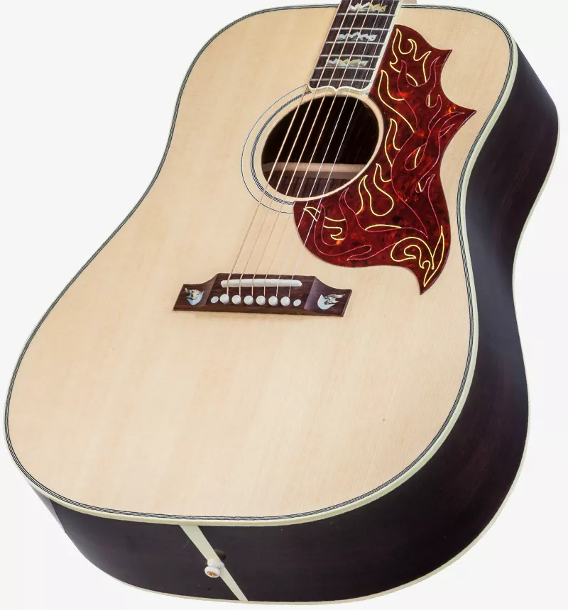 Gibson fait monter la température avec la Firebird Custom Mystic qui n'a aucun point commun avec l'électrique du même nom. Elle propose une table en épicéa Sitka de grade AAA premium surmontée d'un pickguard au format Hummingbird recouvert de flammes, motif qu'on retrouve également sur les repères de touche, le chevalet et la tête dans un mélange d'abalone et "Mother of Pearl". A noter que le fond et les éclisses sont en palissandre Mystic également de grade AAA. Tarif $4999