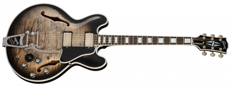 Par ailleurs, la Gibson Custom Gary Clark Jr. ES-355 se distingue aussi par son Bigsby chromé, tout comme le reste de l'accastillage (là où il est généralement doré sur la ES-355), et son incroyable finition Cobra Burst dont le dégradé sombre met bien en valeur l'érable de la table et du dos. Elle est livrée dans un étui orné du logo du bluesman, et n'est disponible qu'à 100 exemplaires, déjà écoulés malgré le tarif typique du Custom Shop. Pour les moins rapides, il est probable que Epiphone propose sa version de cette magnifique ES-355 d'ici peu.