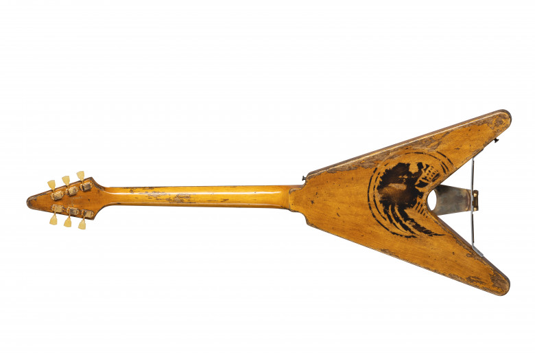Le 10ème modèle c'est la splendide Gibson Custom Shop Leo Scala Flying V Super 58 Seraph. Derrière ce nom à rallonge se cache une superbe guitare qui va beaucoup plus loin dans le design : le contour de micro Dogear breveté est ici en métal plutôt qu'en plastic noir, Leo Scala a opté pour le chevalet à roulements Schaller Roller Tune-O-Matic, et le le Bigsby B7 comme le reste de l'accastillage est de couleur bronze ce qui fait ressortir plus encore le large pickguard symétrique décoré du logo Pontiac de 1937 dans le style Art Déco. Les boutons de potentiomètres sont eux décorés de 15 rubis assortis à la couleur intérieure de l'étui fourni avec la guitare. Le câblage est différent avec un master volume, un master de tonalité mais aussi un sélecteur de split du micro double bobinage. Un dessin noir presque tribal décore le dos de l'instrument et l'on remarque également la plaque de truss rod Seraph custom qui souligne plus encore l'aspect premium de cette guitare.