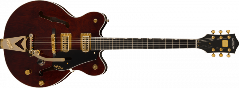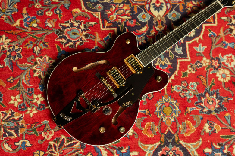 D'ailleurs, la Studiomatic n'est pas sans rappeler la Country Gentleman qui était l'instrument de prédilection de George Harrison entre 1963 et 1965. Il s'agit d'une hollow body (complètement creuse donc) à double pan coupé quart de caisse en érable avec barrage parallèle, avec un manche érable collé et une touche en ébène au radius de 12 pouces. Visuellement, la belle en impose par sa finition Classic Walnut Stain qui s'accorde très bien avec l'accastillage doré, notamment un Bigsby B60 avec découpe en V. Pour la tenue d'accord, les mécaniques sont à blocage.