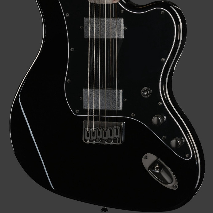 L'instrument compte 21 frettes et adopte une largeur de sillet de 42 mm, des dimensions qui restent dans les standards électriques classiques malgré le diapason allongé. On note également la présence d'incrustations de type block, ainsi qu'une tête assortie à la finition du corps, ici un noir brillant.