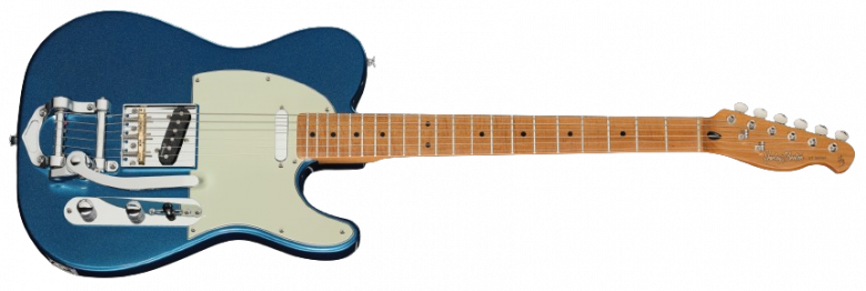 Harley Benton, qui a l'habitude de démocratiser à l'extrême des options qui coûtent un bras chez les autres marques, s'est donc attaqué au sujet et présente trois de ses modèles type Tele avec un vibrato B-Style qui rappelle beaucoup le design du Bigsby B-5, le fameux "horseshoe" (surnommé comme ça en raison de sa forme de fer à cheval), mais en gardant un chevalet à trois pontets alors que le B-5 oblige généralement à passer à six.