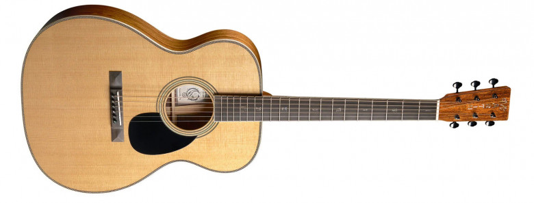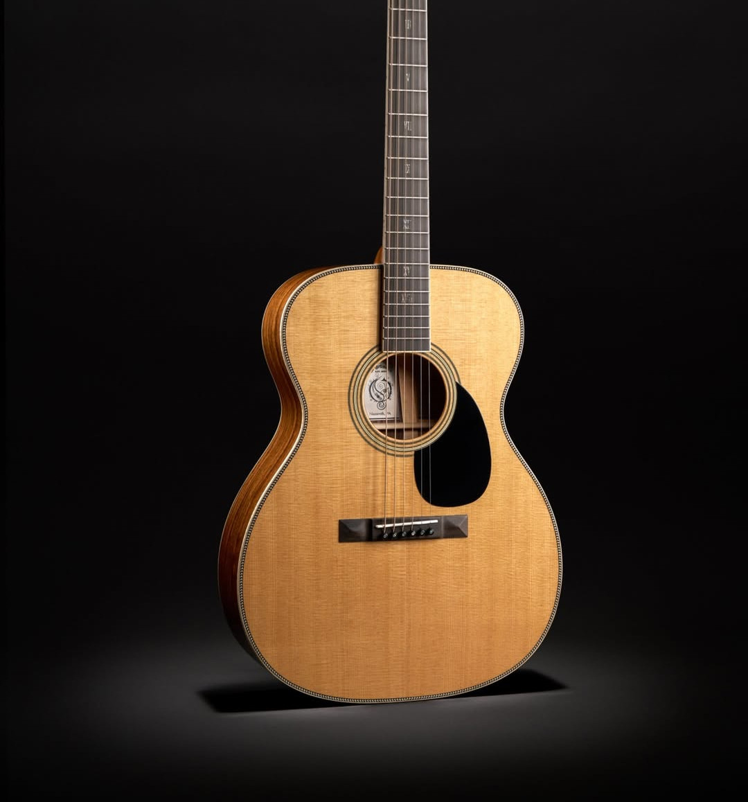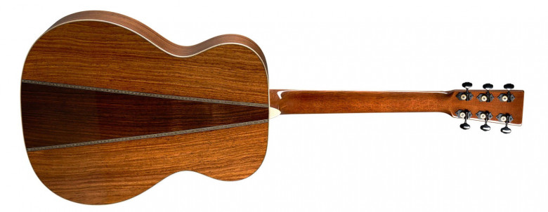 L'idée du chanteur était de réunir ses éléments préférés parmi les Martin historiques tout en continuant d'aller de l'avant. On retrouve donc la forme OM traditionnelle avec une profondeur moins importante que sur une dreadnought. La table est en épicéa Sitka torréfié et elle a reçu le traitement VTS, avec un barrage en X scallopé de type Golden Era, plutôt vintage dans l'esprit donc. À l'arrière, on retrouve le format en trois parties d'une OM-35. Les deux parties sur le côté sont en palissandre du Guatemala, avec une partie centrale plus sombre en palissandre est-indien.