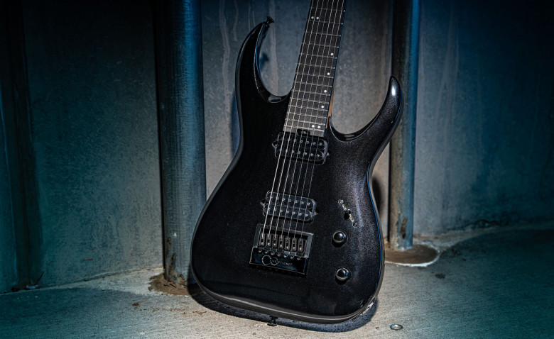 La Jackson Pro Plus Series Signature Misha Mansoor Juggernaut ET7 fait dans le sobre mais très efficace, presque menaçant. Elle est parfaitement noire, de sa finition Metallic Black à son accastillage jusqu'à sa touche en ébène, et les seules touches de blanc qui ressortent sont le logo Jackson de la tête et les très jolis repères en points, du côté des graves pour les premiers et des aigus pour les derniers. Comme sa référence l'indique, la ET7 est une 7 cordes et elle a donc un diapason rallongé de 26,5 pouces. Le manche vissé en érable caramélisé reçoit une touche au radius ultraplat de 20 pouces, le tout avec 24 frettes inox jumbo et les bords adoucis. Allié à l'arrière du manche huilé, on est clairement face à une machine de shred sans concessions.