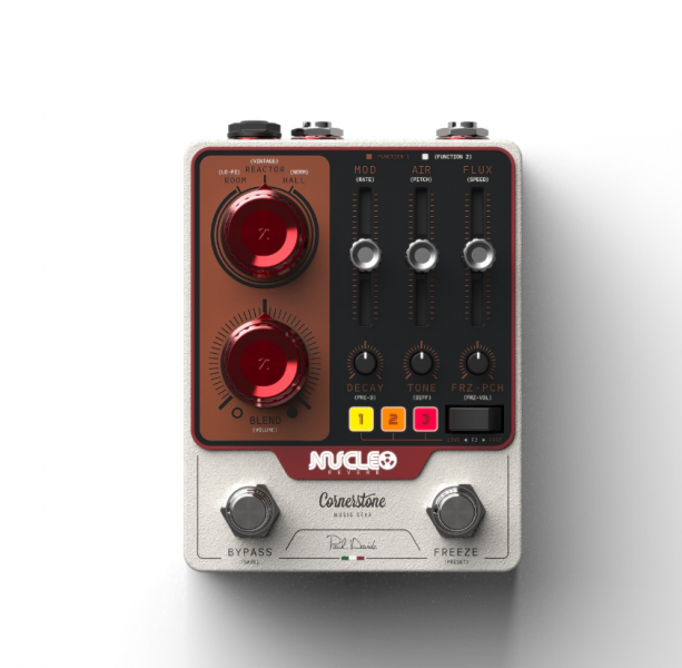 La Cornerstone Nucleo est donc une reverb colossale, et c'est une nouveauté d'autant plus surprenante que la marque italienne n'avait jusque-là produit que d'excellentes overdrives et fuzz. Le format est un peu plus gros que le standard, ce qui permet d'avoir accès à de nombreux réglages, notamment trois sliders Mod, Air et Flux. Il y aussi deux gros boutons rouges ornés du logo de la marque pour doser le son de reverb par rapport au son d'origine et choisir le caractère de l'effet parmi trois algorithmes, Room, Reactor ou Hall. Les fonctions secondaires sont nombreuses, on a aussi trois petits potards et un switch : vous ne risquez pas de manquer de ressources pour obtenir exactement le son que vous cherchez, même si vous voulez vous aventurer au-delà de l'usine nucléaire pour aller du côté de la synthèse granulaire.