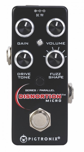 La nouvelle Pigtronix Disnortion Micro reprend là où l'ancienne s'est arrêtée en proposant un format compact pour limiter l'encombrement du pedalboard et surtout profiter du bloc d'alimentation à 9 Volts plus standard que l'ancien à 18 Volts. Pigtronix assure que la plage dynamique (headroom) reste la même. La réduction de format implique que les contrôles sont simplifiés avec 4 potentiomètres pour ajuster le volume, le niveau de gain, la tonalité (Drive Tone) et Fuzz Shape qui offrent 6 égalisations différentes.