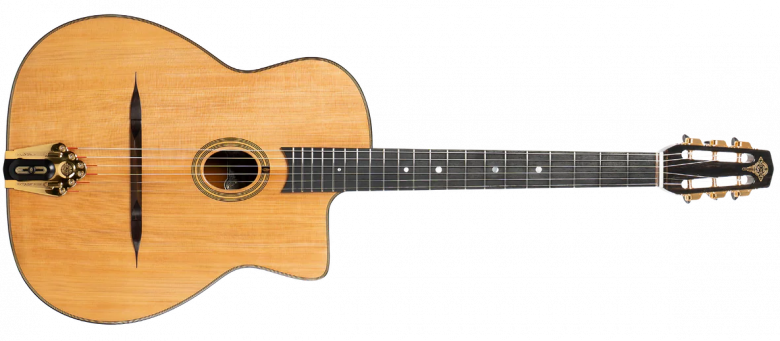 On doit le design au luthier italien Mario Maccaferri, qui a convaincu Henri Selmer de produire son drôle de modèle de guitare jazz. D'abord avec la rosace large et un résonateur ("grande bouche") puis plus réduite ("petite bouche"), la guitare Selmer s'est imposée comme un son bien à part, plus puissant et percussif que les américaines, et avec un pan coupé permettant toutes sortes d'acrobaties. Et bien sûr, c'est devenu le modèle de prédilection du génie Django Reinhardt, qui a à tout jamais défini l'utilisation parfaite que l'on pouvait faire d'une Selmer. Mais cette association n'a pas suffi à offrir un succès massif au modèle, et 885 guitares seulement ont été fabriquées entre 1932 et l'arrêt du modèle en 1952. Avec la mode du jazz manouche dans les années 2000, de nombreux luthiers français se sont réappropriés le design (Dupont notamment), jusqu'à la marque japonaise Aria qui proposait la MM20 à un prix très accessible. Et bien sûr les Selmer originales ont fini par atteindre des côtes absolument stellaires sur le marché de l'occasion.