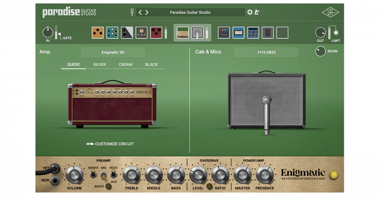 Jusque-là, il fallait acheter ces amplis de façon individuelle, et ajouter d'autres plugins pour les effets. Mais ça n'est plus le cas avec la sortie de Universal Audio Paradise Guitar Studio. Comme son nom l'indique, ce plugin représente un studio "idéal" pour guitariste dans lequel l'amateur de beau son trouvera de quoi enregistrer des prises ultra crédibles. La marque annonce 11 amplis, mais on en trouve en réalité six, dont certains proposent plusieurs sous-modèles. Le Enigmatic '82 par exemple, qui apparaît d'ailleurs en même temps que ce plugin Paradise, reprend la pédale du même nom, un Dumble avec quatre modes différents, un par décennie. Pour les cinq autres, on retrouve des plugins qui existaient déjà sous formes indépendantes (un peu dur pour ceux qui les ont déjà achetés donc) : le Dream '65 (Fender Deluxe Reverb), le Lion '68 (Marshall Plexi), le Showtime '64 (Fender Showman), le Woodrow '55 (Fender Deluxe tweed) et le Ruby '63 (Vox AC30). Dommage, il manque les deux amplis virtuels plus métal sortis récemment sous forme de pédales (Mesa Boogie Dual Rectifier et Peavey 5150), espérons qu'ils soient prévus pour une prochaine mise à jour gratuite de préférence. Comme on peut s'y attendre, de nombreux baffles et hauts-parleurs sont disponibles, repris par de nombreux micros virtuels.