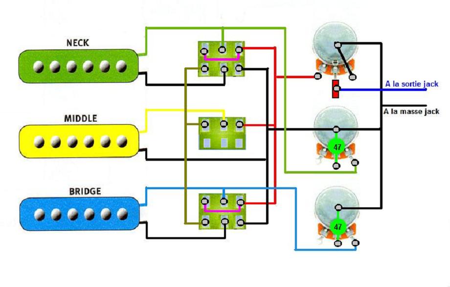 Donc, il s'agit d'une gratte avec micros manche et chevalet Fender (je ne connais pas les modèles exacts) et micro milieu Seymour Duncan five-two.