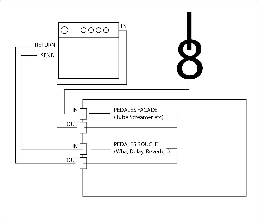 Neutrik femelle en entrée du PB depuis le send de la boucle > pedales boucle > Neutre femelle en sortie vers le return de la boucle.