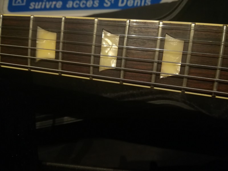 J'ai finalement opté pour des inlays en celluloïd avec effet vieilli et nacré, un peu jaunis, trouvés pour 20€ sur eBay. Après réflexion, on parlait tout de même d'une Epi, d'aussi bonne facture soit elle... Ca reste une Epi standard de 93. Et avec moi qui n'a aucune formation en lutherie... Pas la peine de mettre des mille et des cents dans de la vraie nacre!