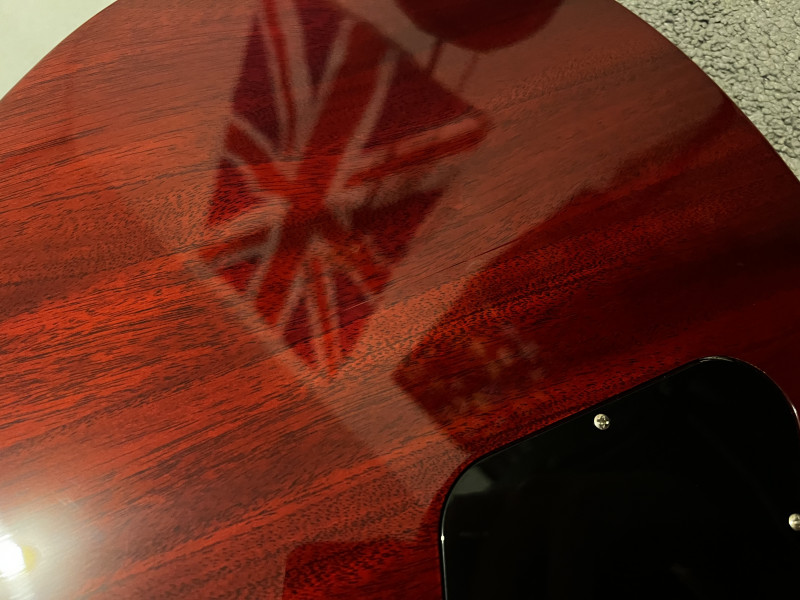 D’autre part, je remarque une espèce de fissure derriere le corps, qui met bien evidence les deux pièces collées de la guitare.