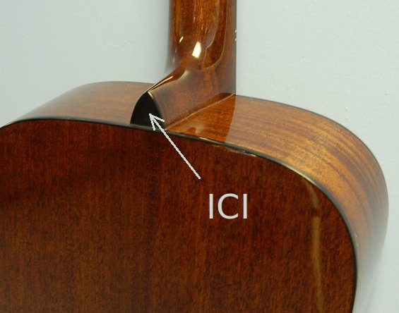 Mais maintenant je commence à regretter d’avoir choisi cette emplacement à la hâte pour des raisons pratiques (accès aux aigus) et esthétiques … j’aimerais savoir dans quelle mesure il serait possible de le mettre à l’arrière du talon : (Ce n'est pas ma guitare, c'est juste pour situer l'endroit)