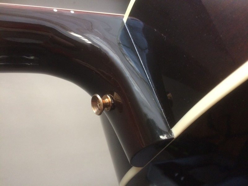 Je suis l’heureux possesseur d’une Gibson J-45 standard sur laquelle j’avais fait installer une courroie d’attache de sangle coté manche car elle n’en avait pas à la base. à l’époque, sans trop y réfléchir j’ai choisi un positionnement très standard pour l’attache comme voici sur la photo :