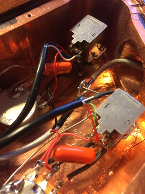 J'utilise actuellement ce câblage (type Suhr), qui permet avec une résistance (510k dans mon cas) d'avoir les simples en 250k et le HB en 500k, avec une tona dédié au HB en 500k également (capa 22nF) et la tona du milieu est pour les positions avec les simples (5-4-3-2), un 250k donc (avec capa 47nF):
