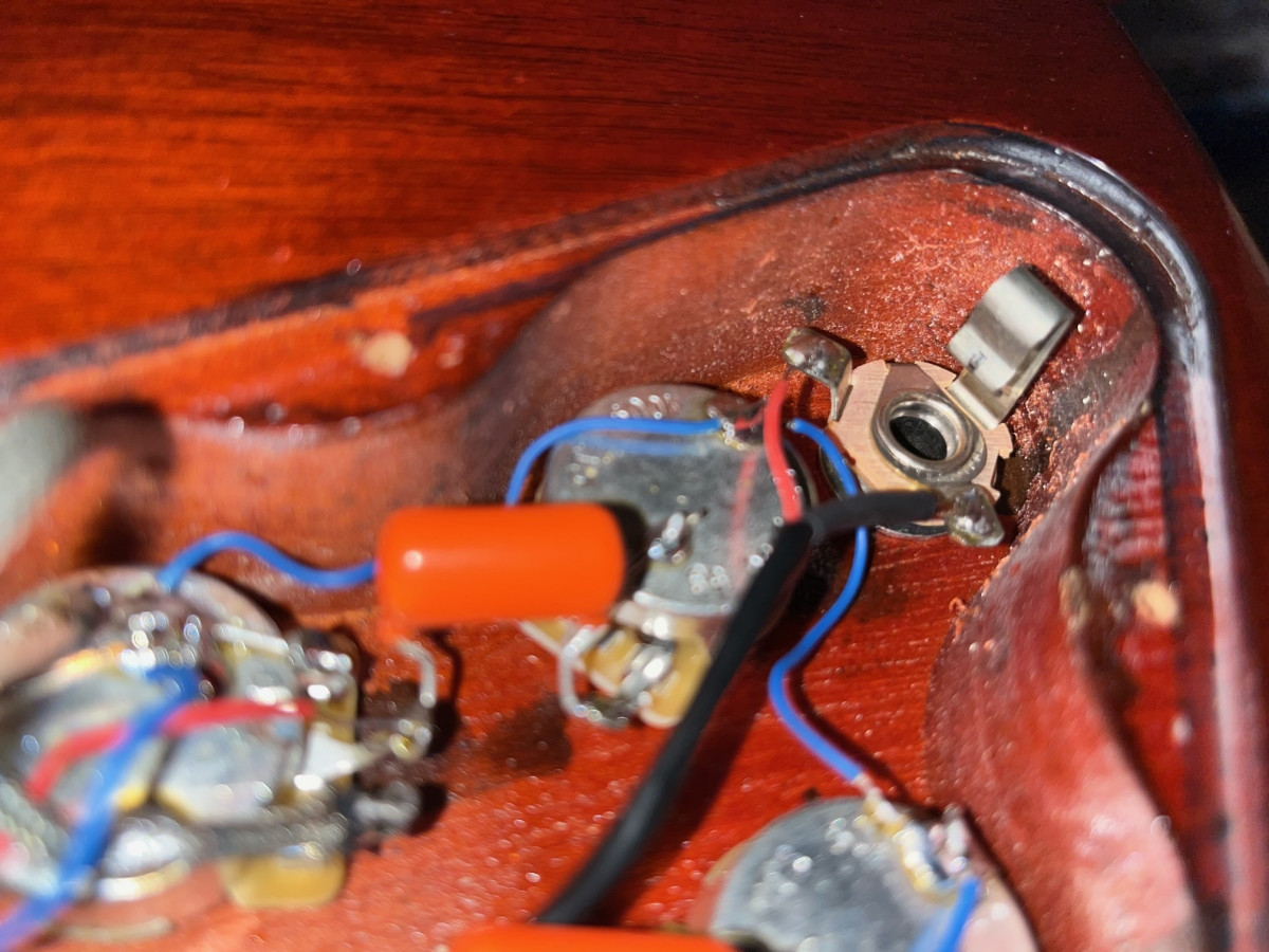 Le fil de câblage sélecteur/volume manche est un peu trop dénudé et me semble risquer toucher le capot.