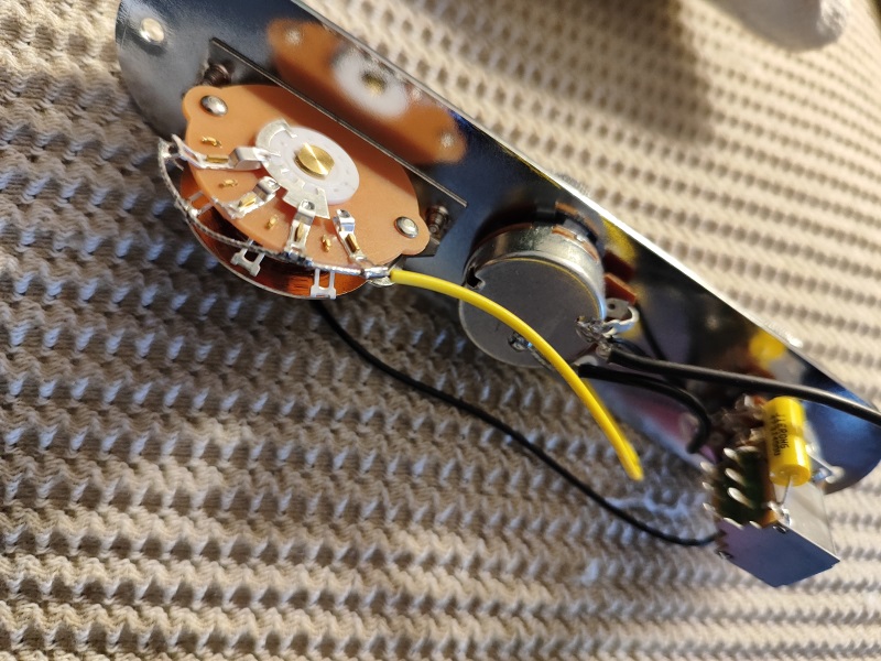 utilise le blindage du cable blindé des micros pour le relier à la masse de ton switch micros, ensuite utilise un cable blindé entre la sortie du switch vers le potentiomètre de volume en reliant le blindage de chaque coté, masse switch et masse potentiomètre (broche du bas du potentiomètre relevé et soudé sur le capot du potentiomètre), ensuite encore un cable blindé du potentiomètre à l'embase jack. blindage de la masse du potentiomètre à la masse du jack, c'est à dire à l'ohmètre la broche relié à la partie filetage de l'embase (là ou tu mets l'écrou pour fixer l'embase jack). en soudant le blindage du cable sur l'embase jack, dénude le blindage sur au moins 2cm, voir trois, soude le blindage sur la broche correspondante de l'embase jack, en laissant un bout de blindage très court pour le souder sur la broche "masse", et le fil isolé au centre du cable blindé, avec ses 2 à 3 cm de longueur, le souder en faisant une boucle jusqu'à la broche" signal" de l'embase jack.