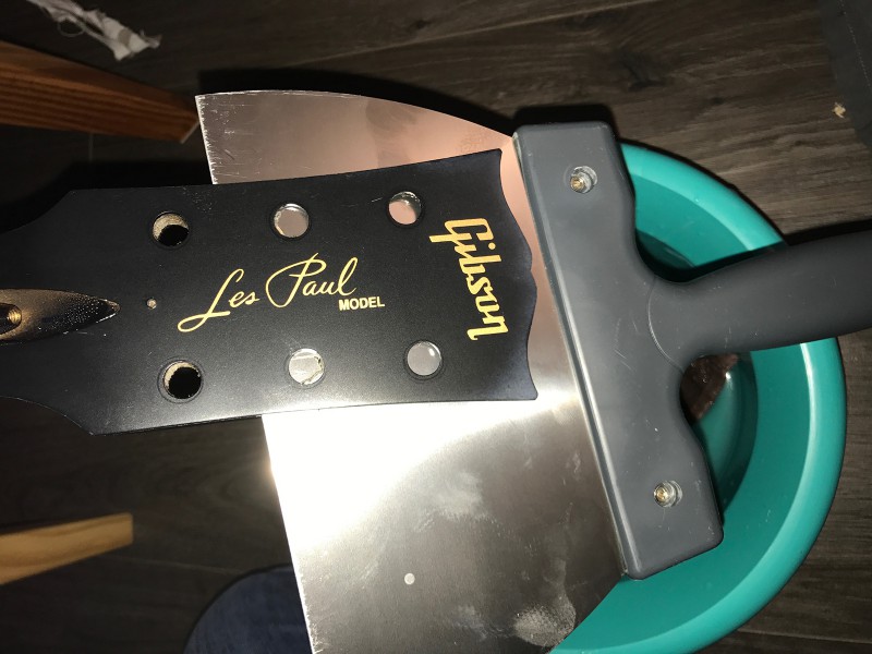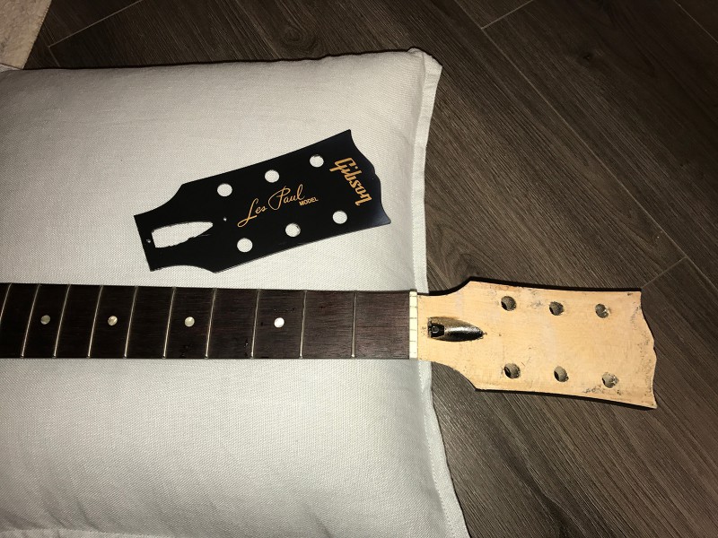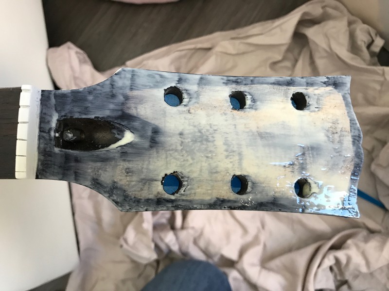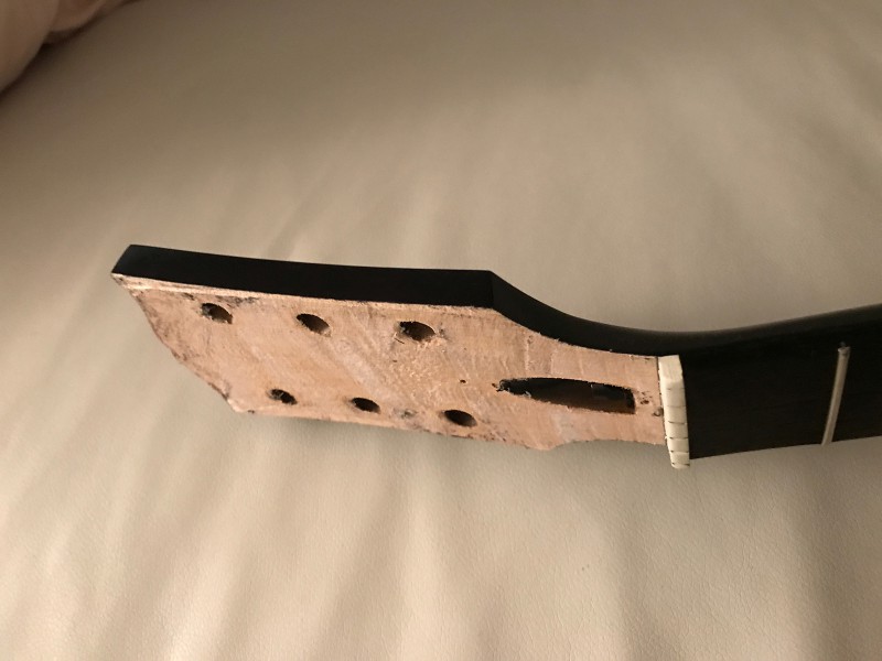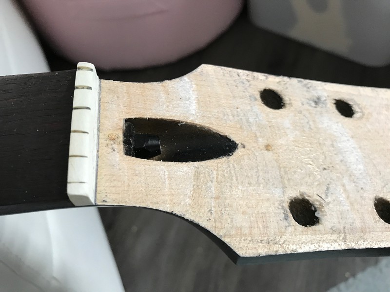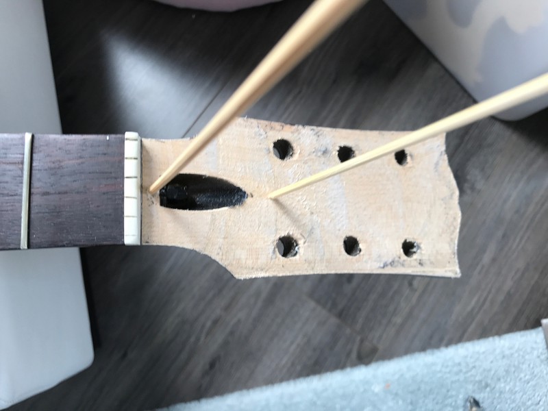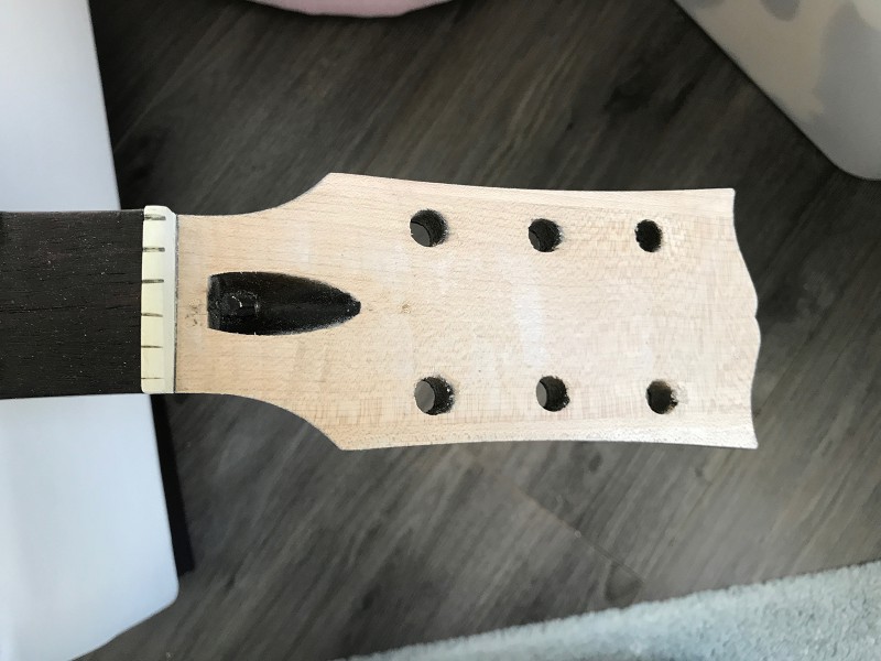 Premièrement, j'ai décider de boucher les trous de vis du cache trussrod. Je n'ai pas envie de me retrouver avec une cloche qui gigote quand tout sera monté...