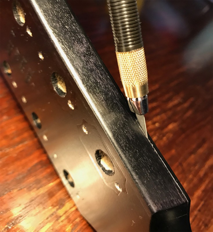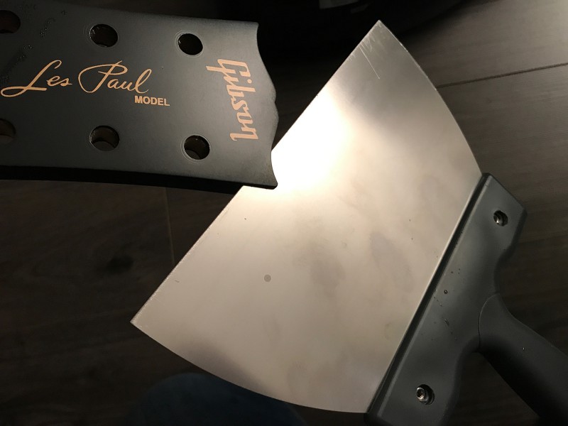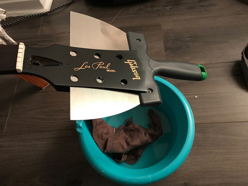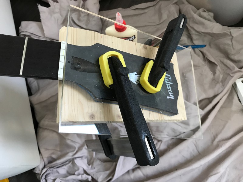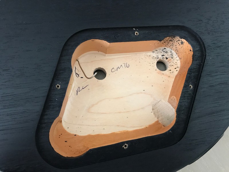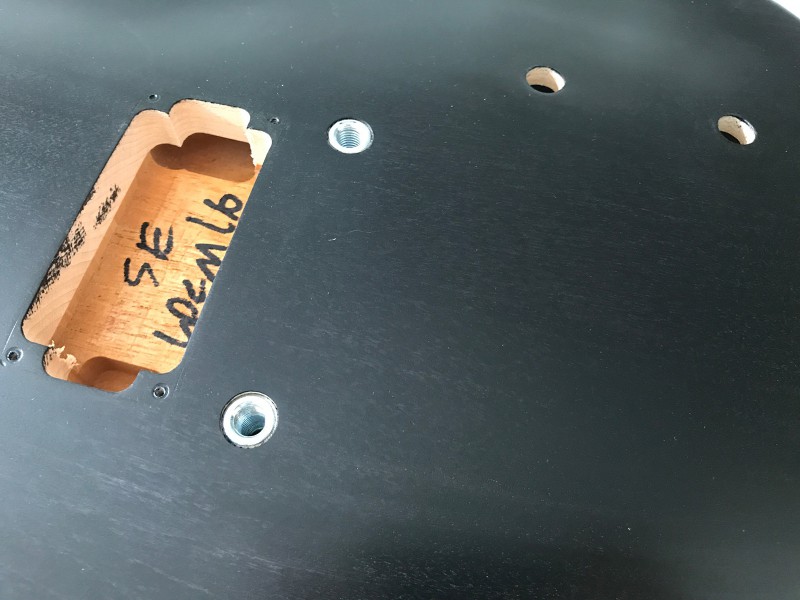 Premièrement, j'ai décider de boucher les trous de vis du cache trussrod. Je n'ai pas envie de me retrouver avec une cloche qui gigote quand tout sera monté...