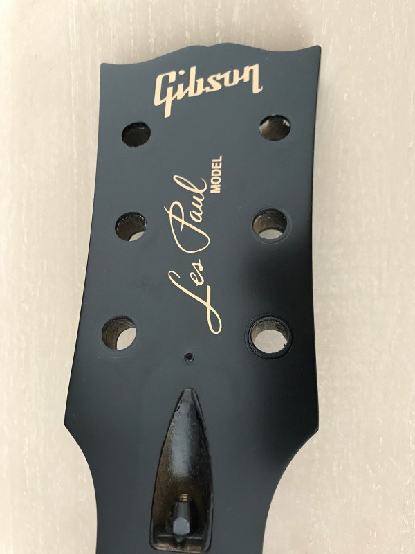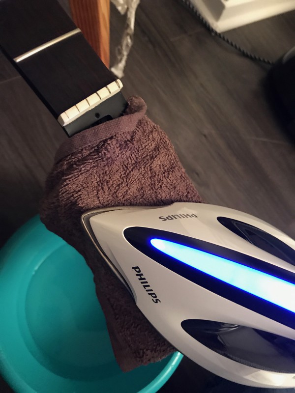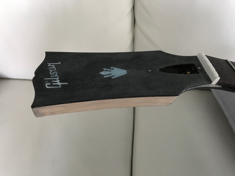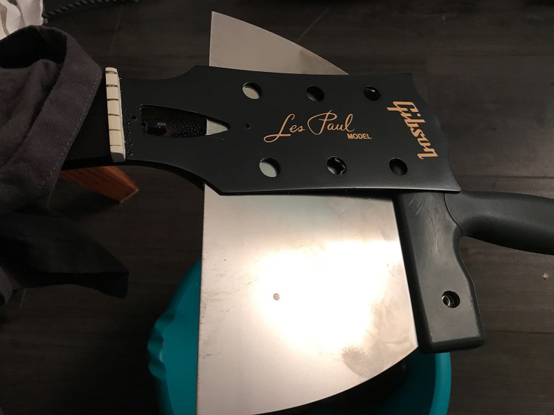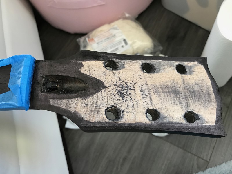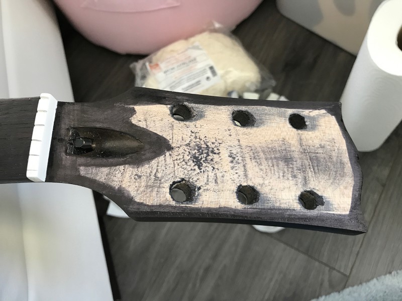Deuxièmement, même si ça sera caché par la cloche qui recouvre l'extrémité du trussrod, ça me dérange que tout ne soit pas noir. Je passe donc un petit coup de teinture d'ébéniste à cet endroit. J'en profite aussi pour faire le tour de la tête (on ne sait jamais), et aussi pour vérifier qu'il ne reste pas trop de traces de l'ancienne colle à bois.