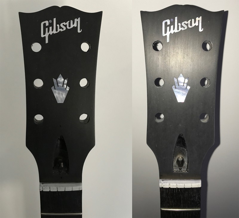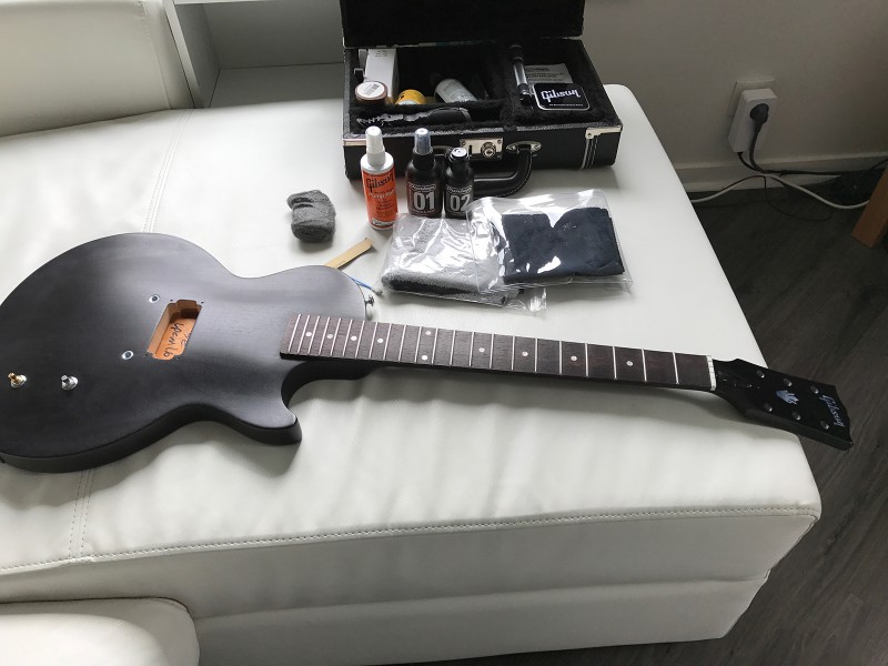 Pour la touche, un coup léger de paille de fer super fine, un bon nettoyage au Dunlop 01 et un finish au Dunlop 02. Pour le corps, du polish Gibson et un petit coup de chiffon à lustrer Fender :