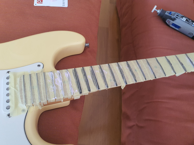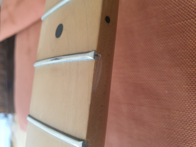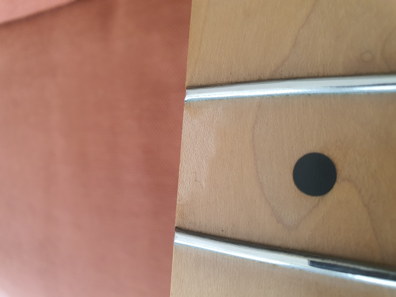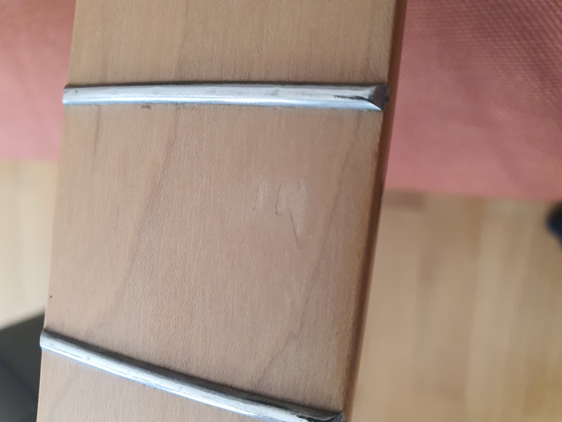 OK, c'est commun sur ces Strat des années 90's. Sinon, c'est un vernis Poly donc difficile de faire des retouches discrètes là dessus. Faudrait poncer le manche et le revernir. Après à voir si ça te gêne au niveau sensations.