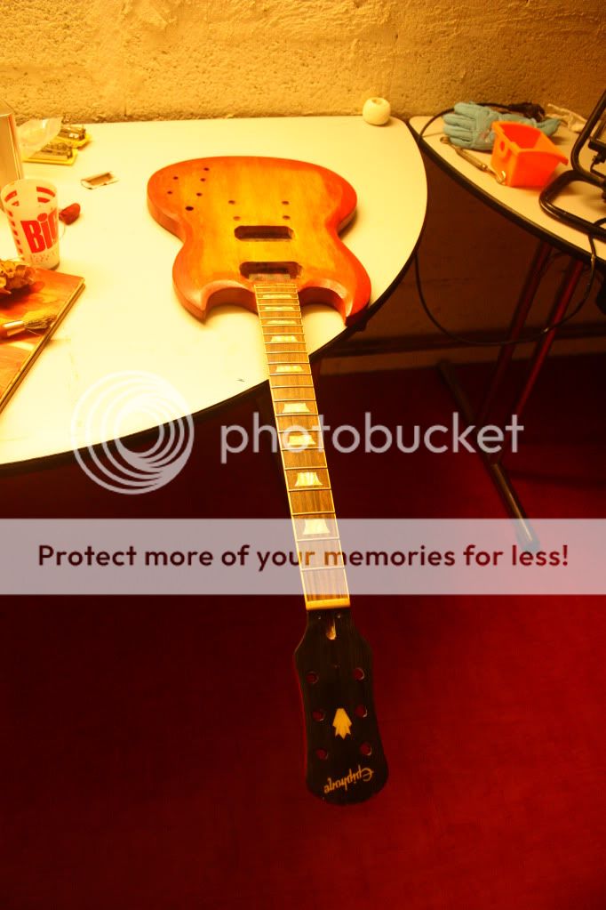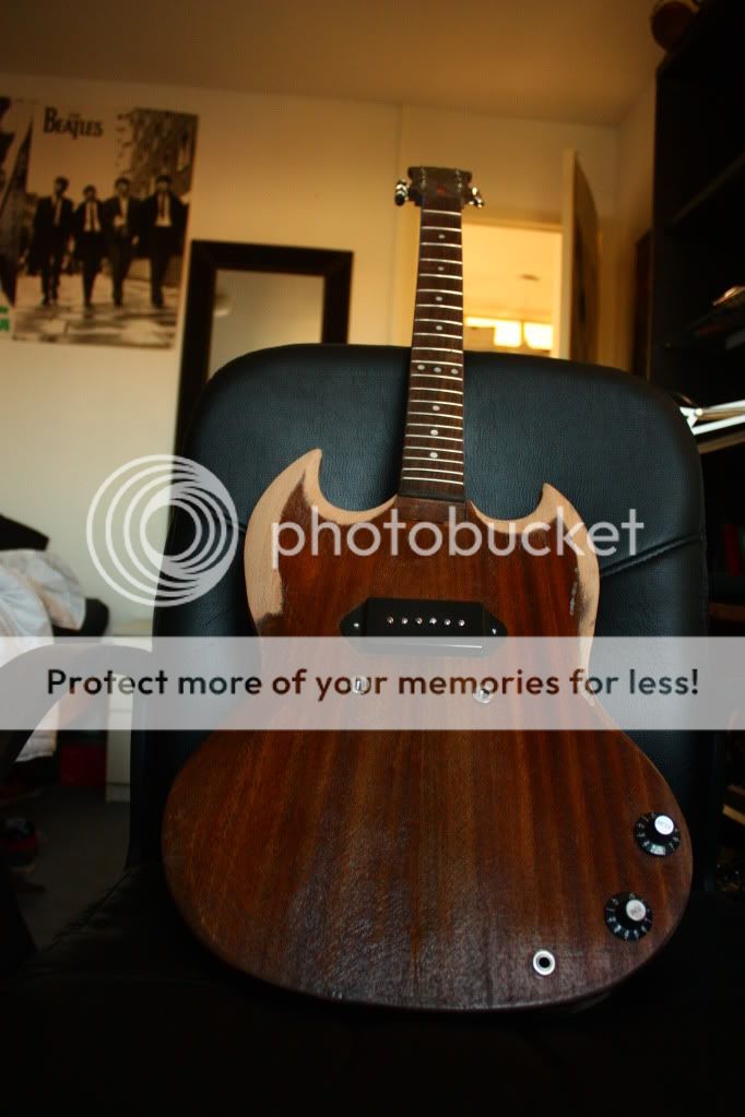 Voilà, juste avant les petites photos, bah j'avoue être quand même content, cette guitare est jouable, assez confortable même si le manche impressione au début, et elle sonne. Je pense que le P90 lindy frallin la propulse loin en terme de son devant une SG junior genre Vintage wilkinson, mais clairement, la finition est en dessous je pense d'une vintage, même si elle me convient tout à fait. Dans l'état, le sillet est pourri, le manche a quand même pris des pocs pendant que je poncais les frettes, le réglage du Wrap ferait certainement peur à quelqu'un de non averti, le manche est pas tout à fait dans l'axe normal du corps, les mécaniques des cordes aigues sont un chouilla plus haut que les mécaniques des cordes basses. Tout ça fait que je n'acheterais pas cette gratte le prix qu'elle m'a côuté en matos 350 euros de matériel, 50 euros de consommable : colle abrasif, vernis... 200 euros de matos (scie sauteuse, défonceuse, différentes mèches et fraise...) que je n'ai pas encore amorti sur d'autres projets. Mais ces défauts n'altèrent ni le son ni la jouabilité en dehors du sillet à changer, donc pour un projet perso, je suis content !