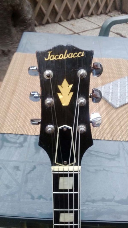 Il s'agit d'une Jacobacci modèle Sacha Distel de 1978 que je viens d'acheter. Pas de problème particulier à signaler, sinon un son exceptionnel. Elle ne se désaccorde pas. J'ai acheté après 2 bonnes heures d'essai et tellement conquis par le son que je n'ai même pas fait attention à cette marque qui semble n'affecter que le vernis.