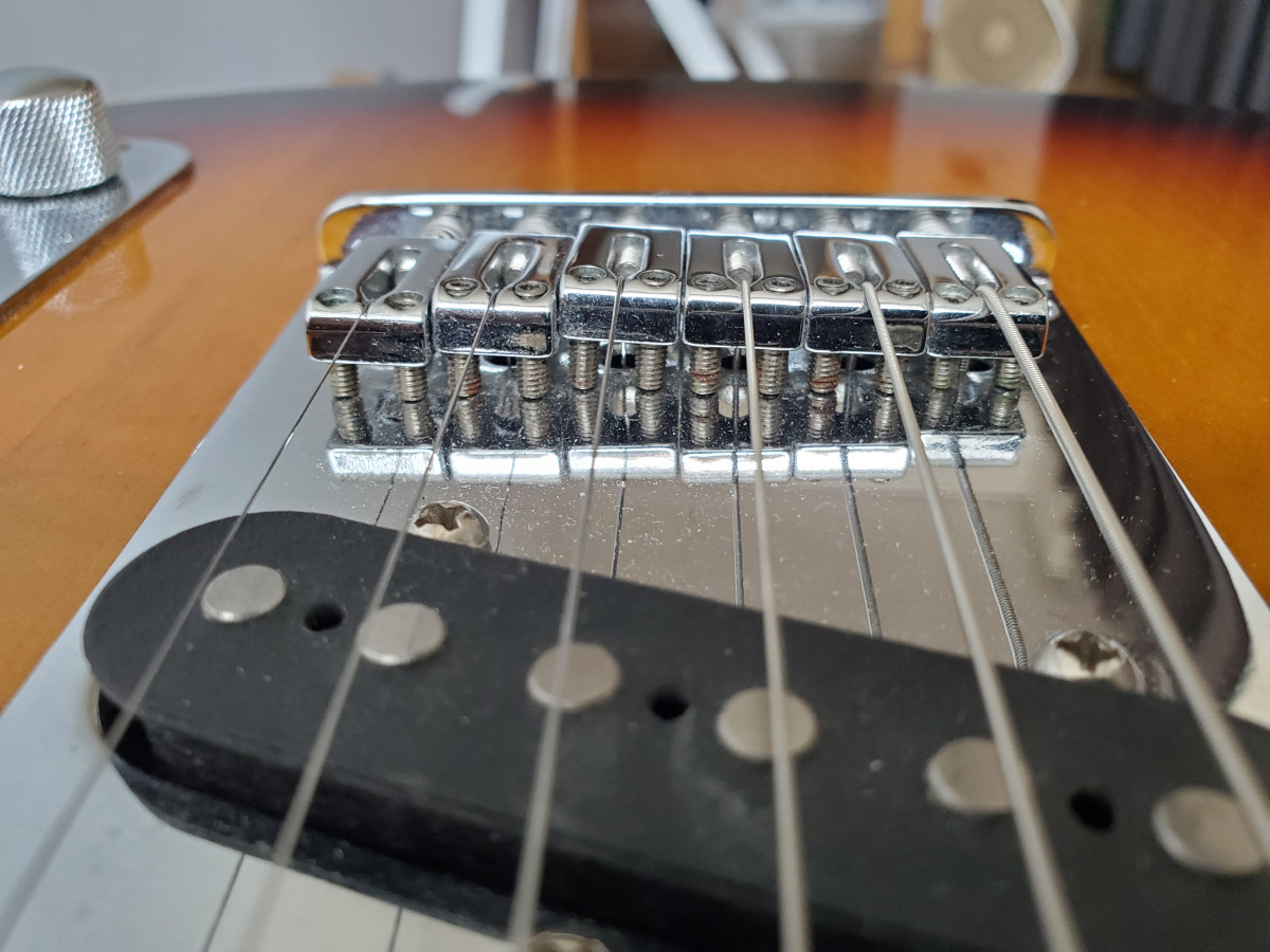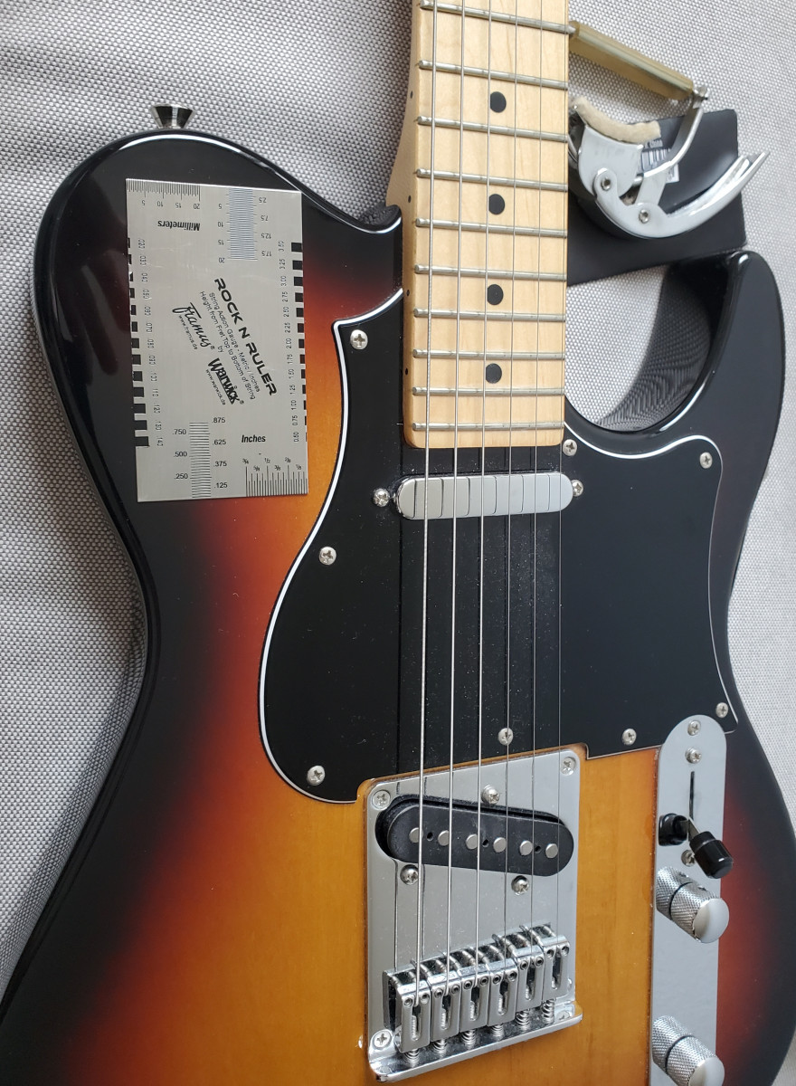 Au niveau hauteur des pontets, mesuré avec une petit règle, j'ai 1.80 à la 12 case en position de jeu sur le mi grave et 1.50 sur le mi aigu. Comme je n'ai pas d'outil pour le réglage de la hauteur des cordes, j'essaie de respecter le radius de 10 à l'oeil