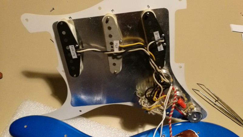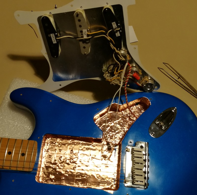 J'en ai profité pour recouvrir les évidements micros avec du ruban cuivré. Il me reste à finir le pickguard. Je suis en rupture de stock.