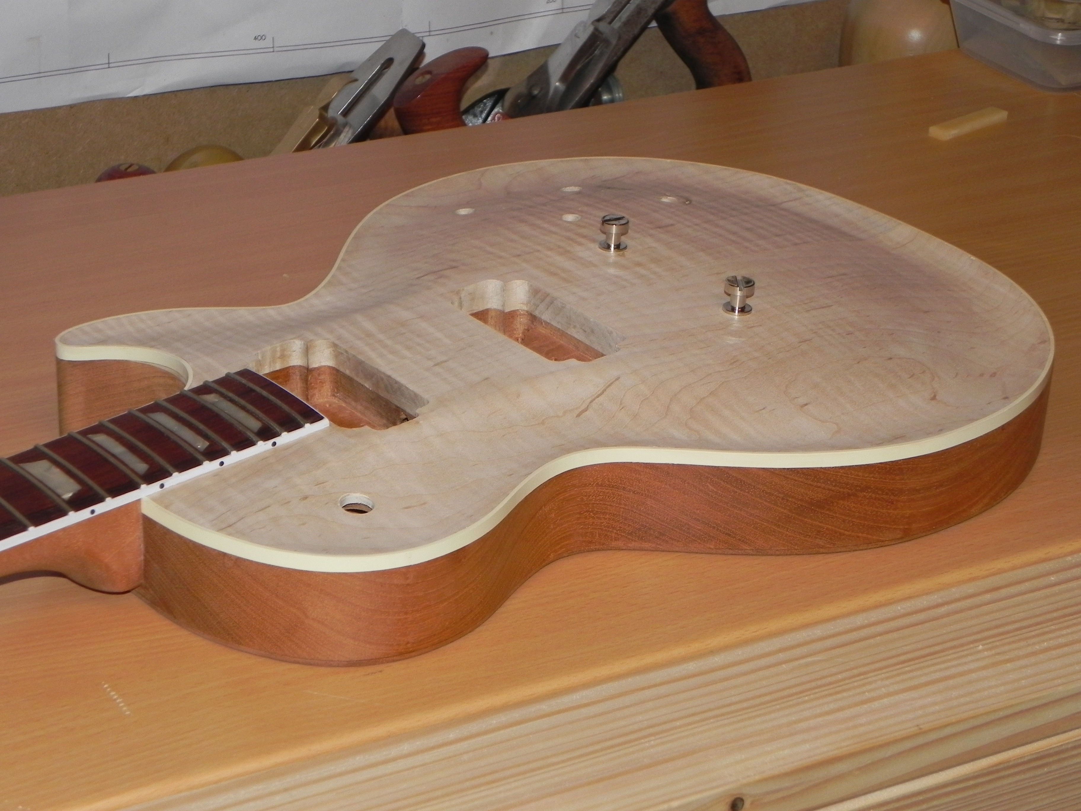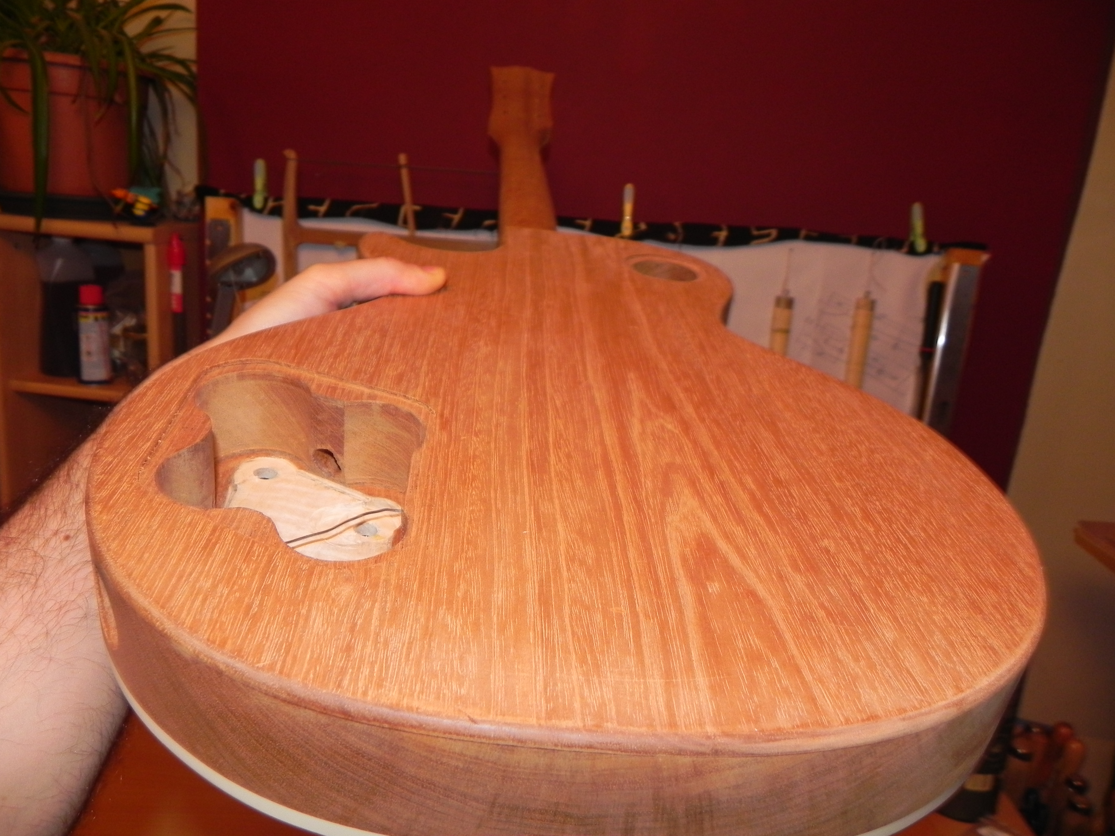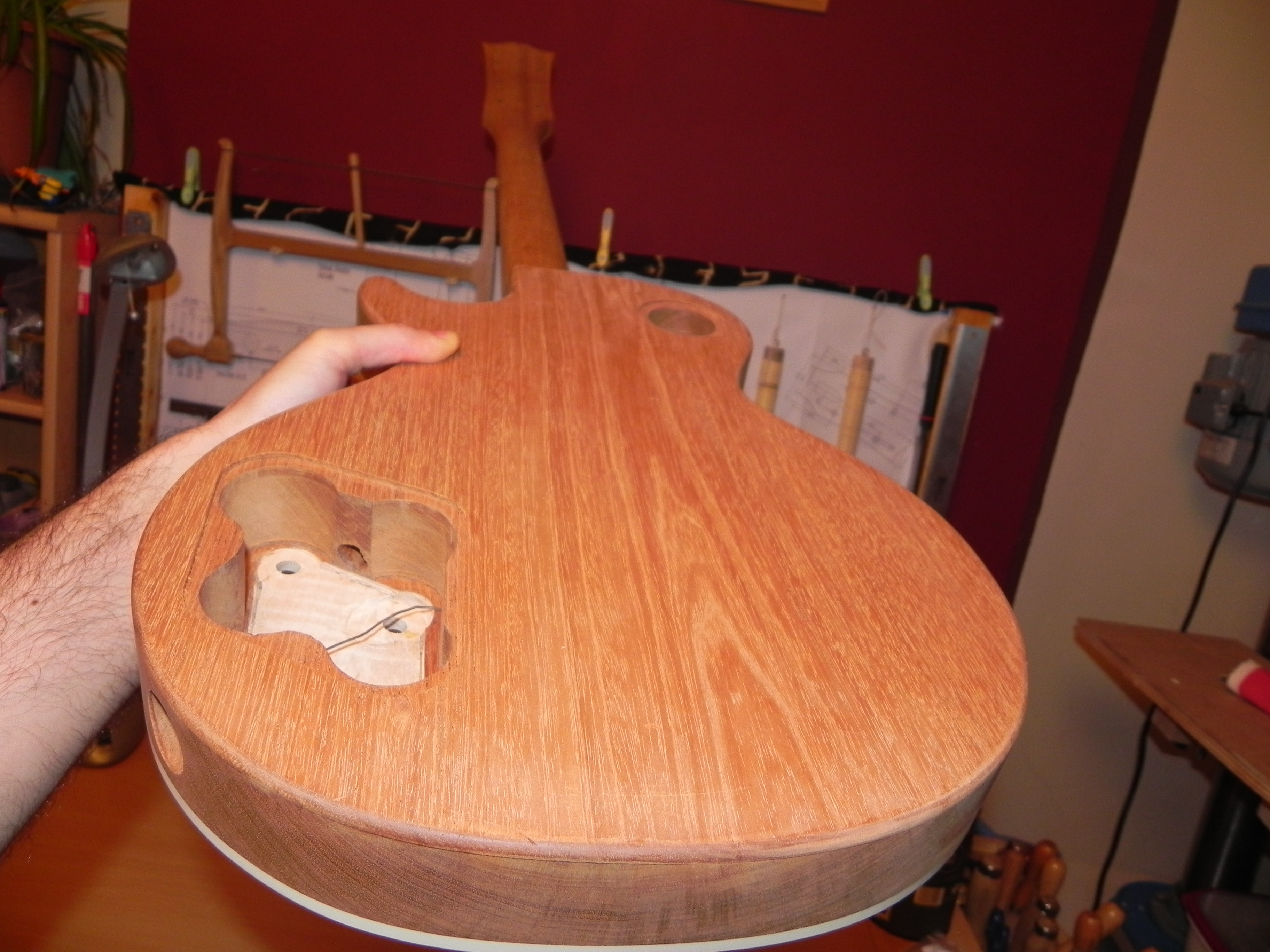 la guitare a été poncé et raclé pour recevoir la finition mais ça c'est pas avant un petit moment ( et là ça me frustre un peu) je pense faire le bouche pore et passer un coup d’encollage sur le top histoire de le protéger un peu