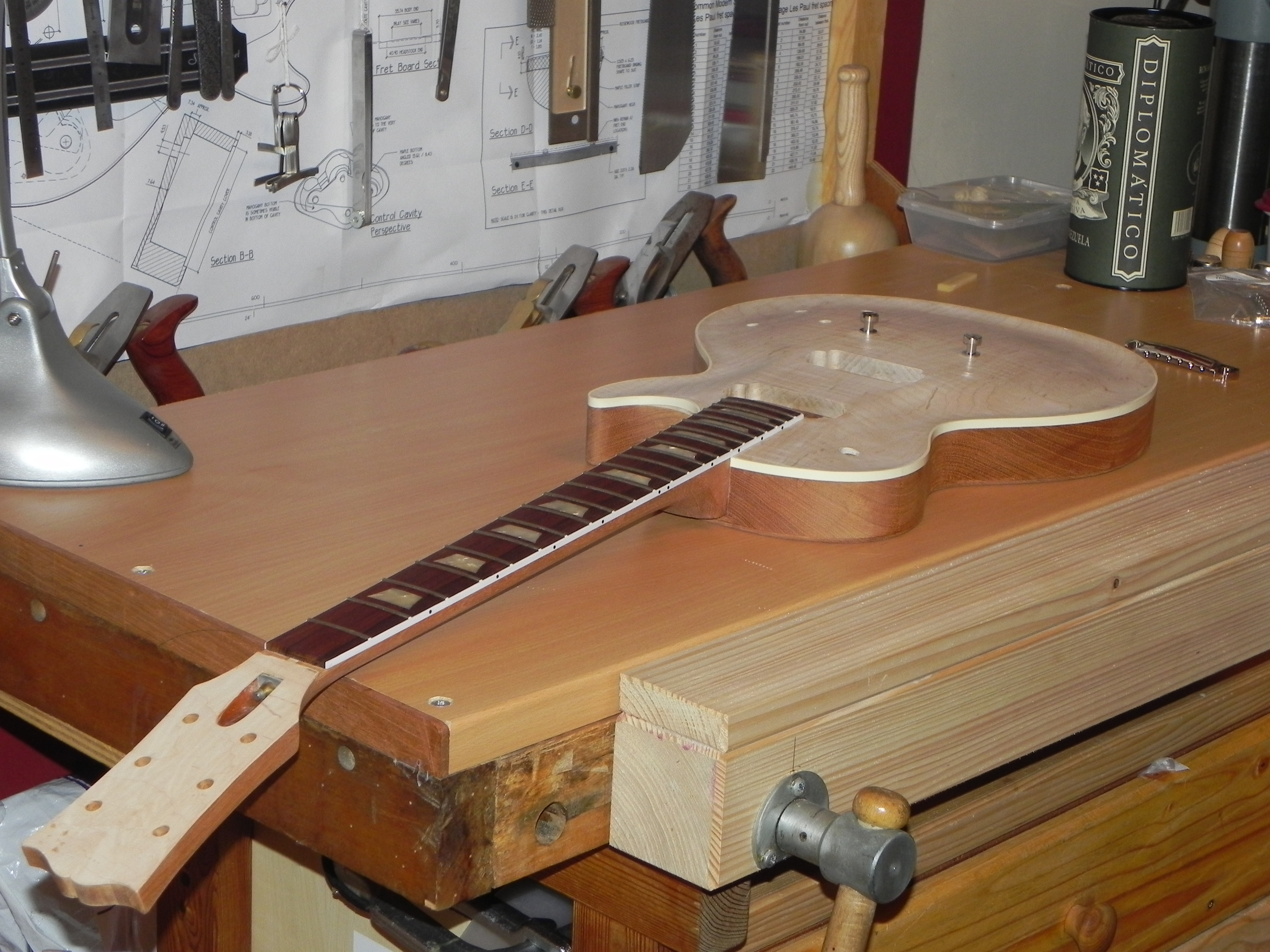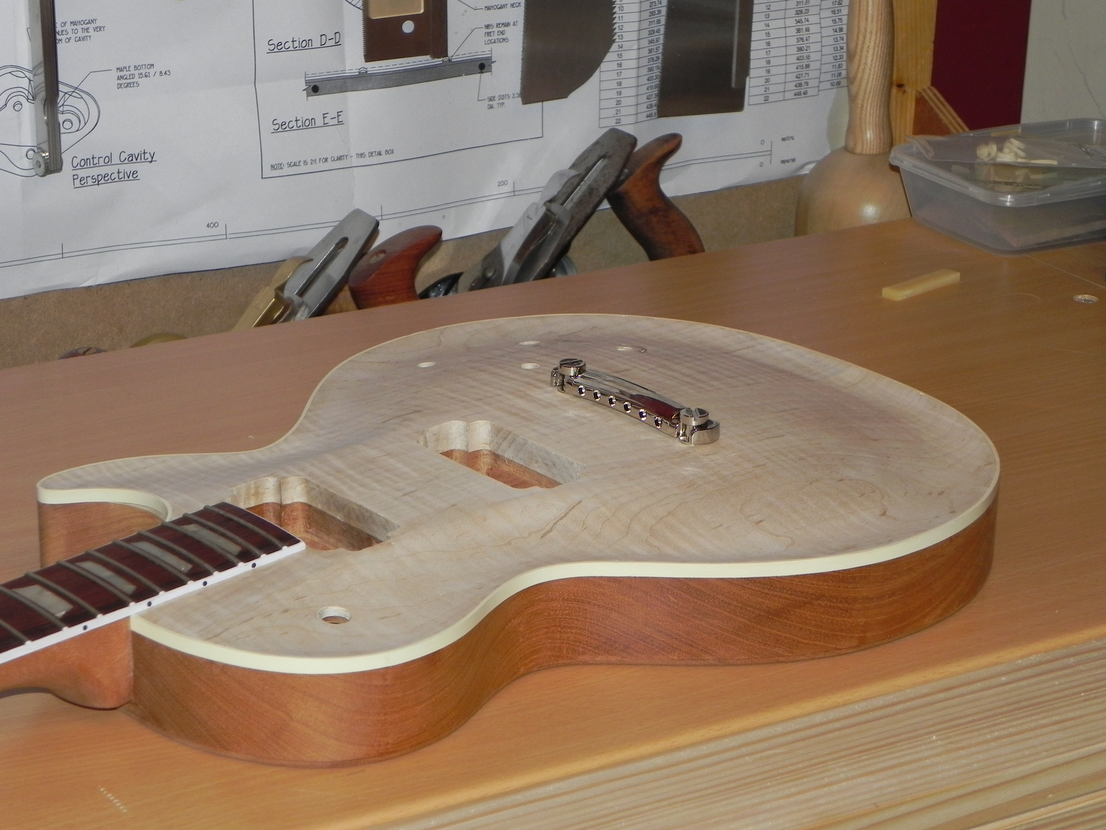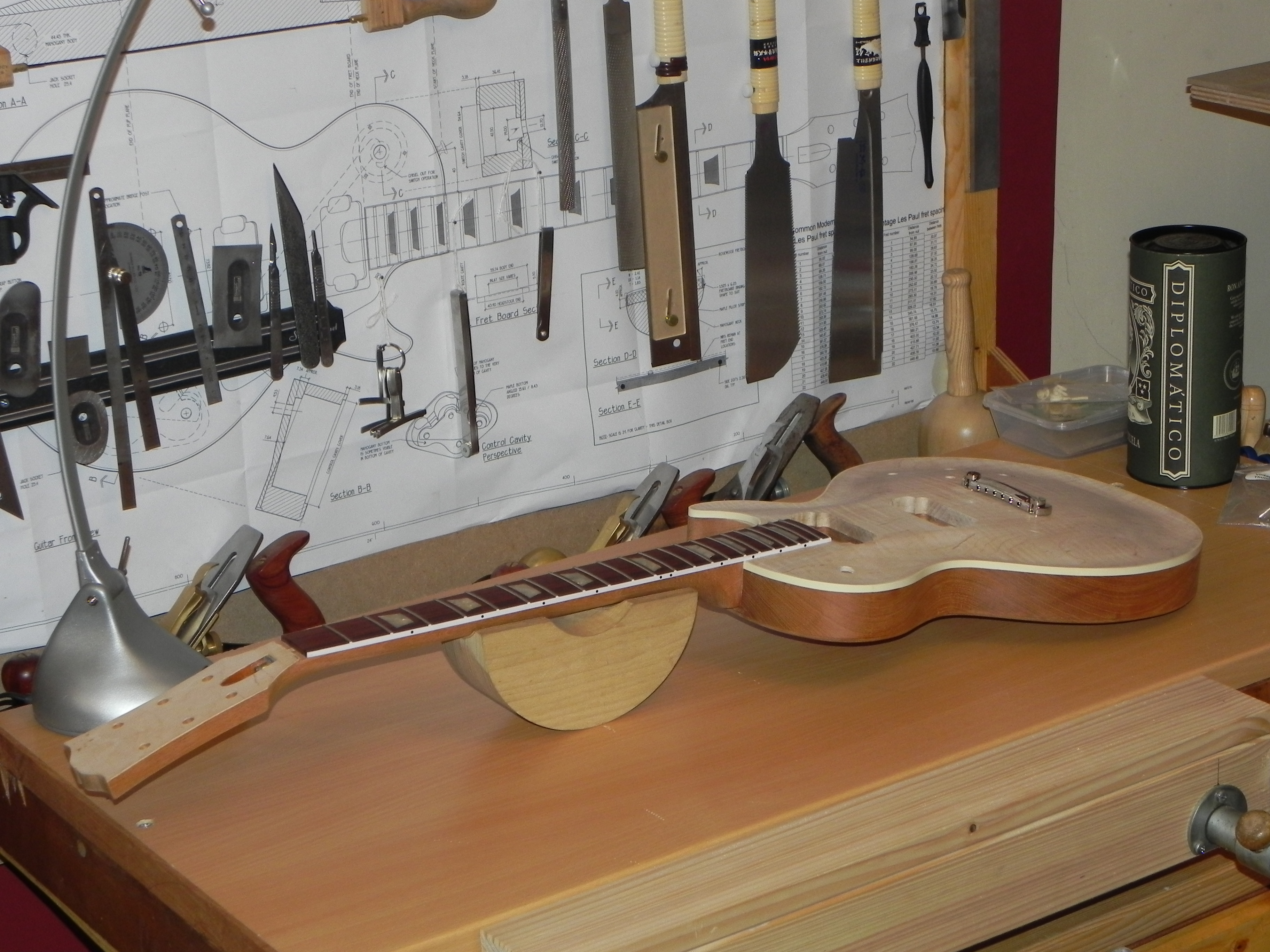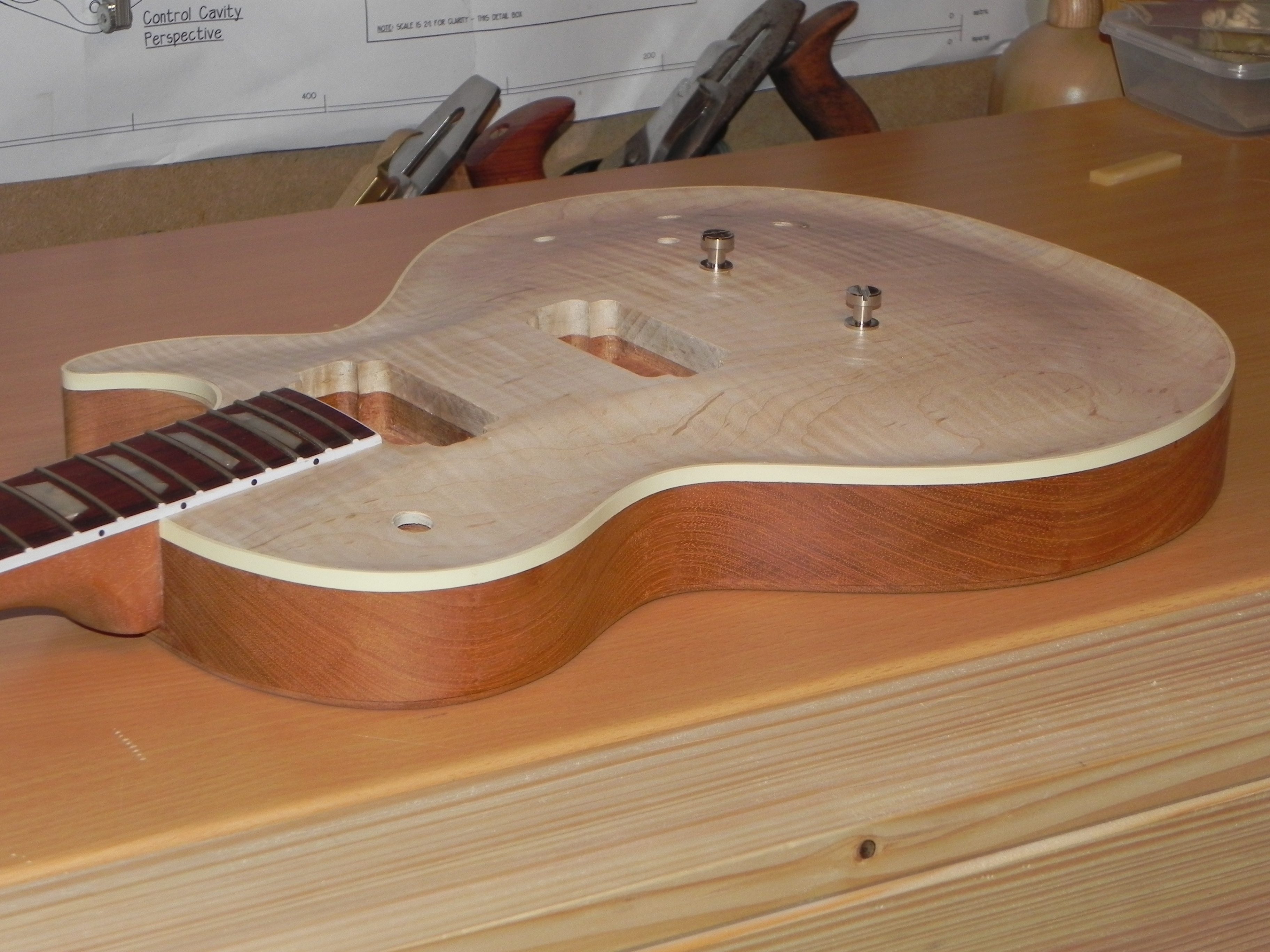 la guitare a été poncé et raclé pour recevoir la finition mais ça c'est pas avant un petit moment ( et là ça me frustre un peu) je pense faire le bouche pore et passer un coup d’encollage sur le top histoire de le protéger un peu