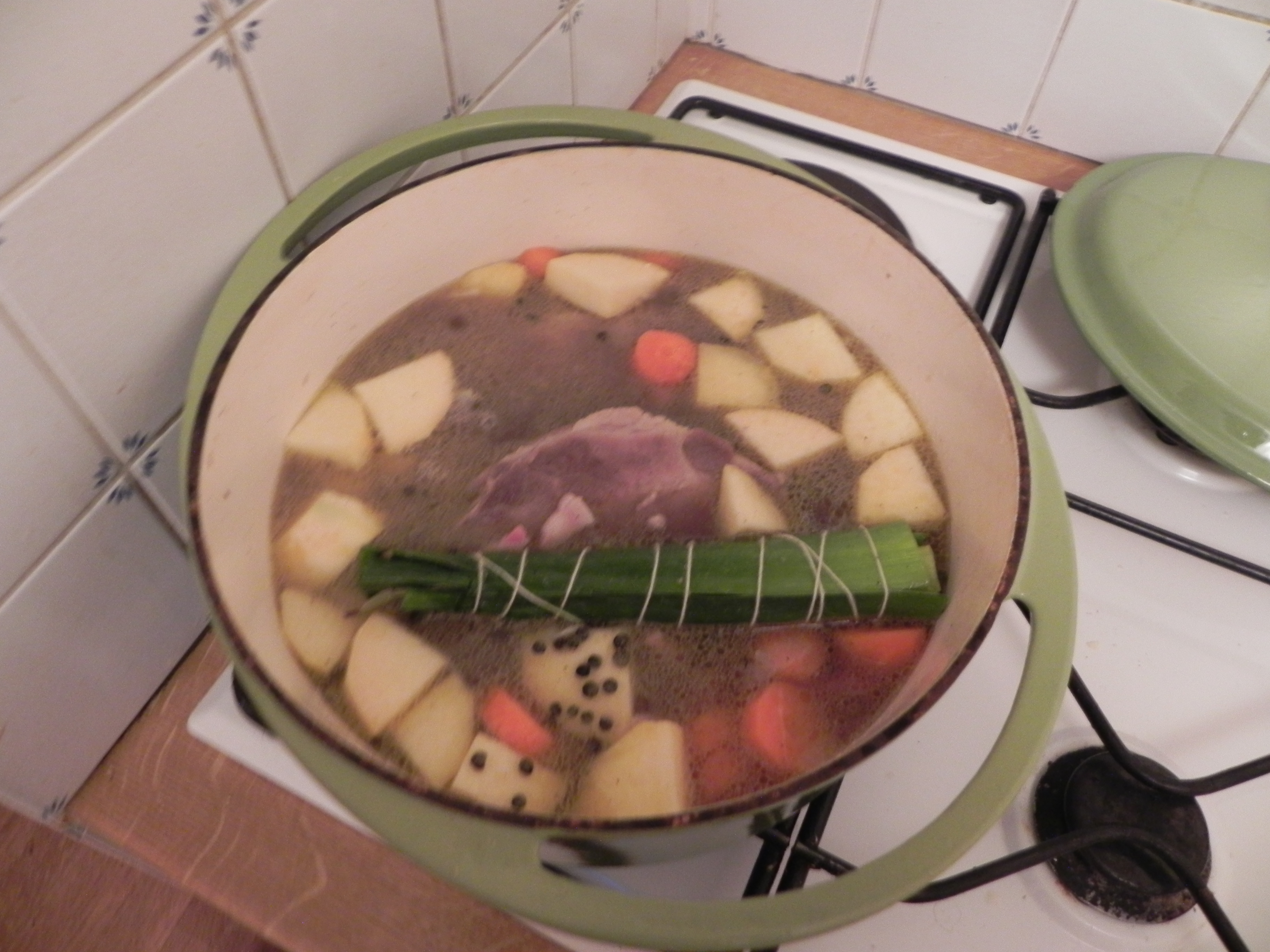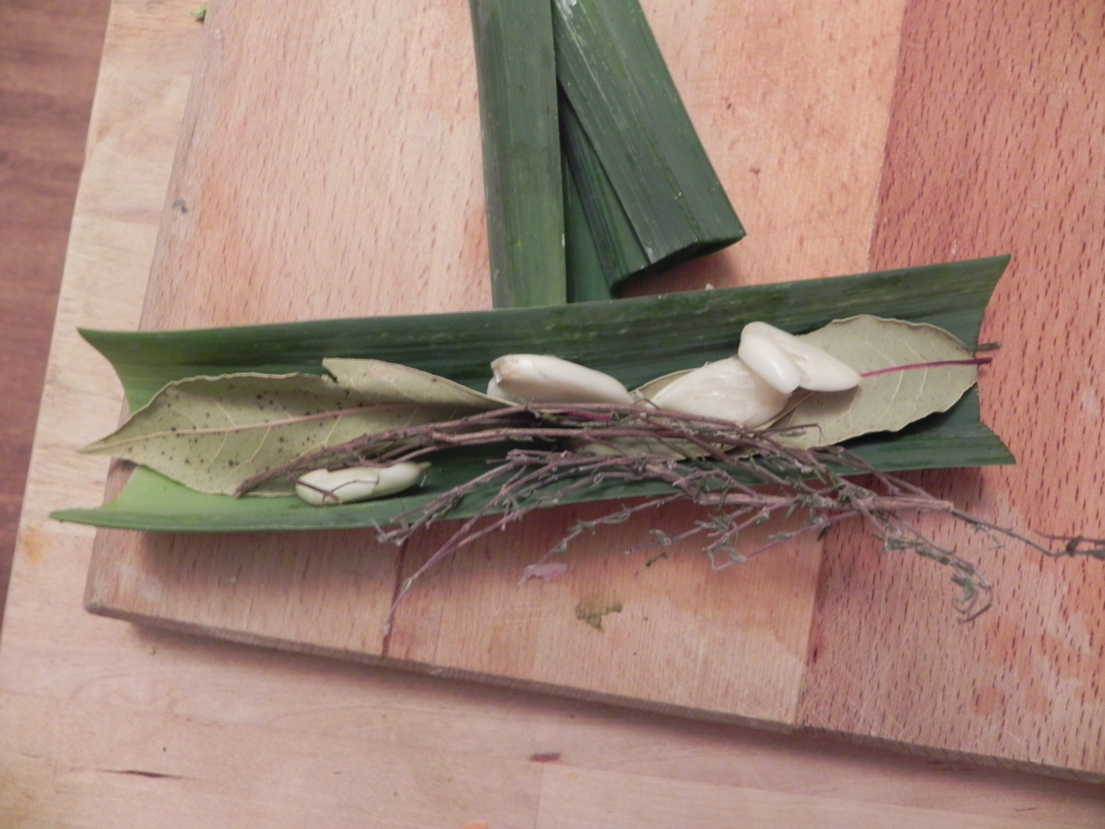 le vert de poireau old growth sur lequel on vient poser délicatement pour pas tout faire éclater de l'ail écrasé, du laurier et le thym car c'est bon pour le suce thym
