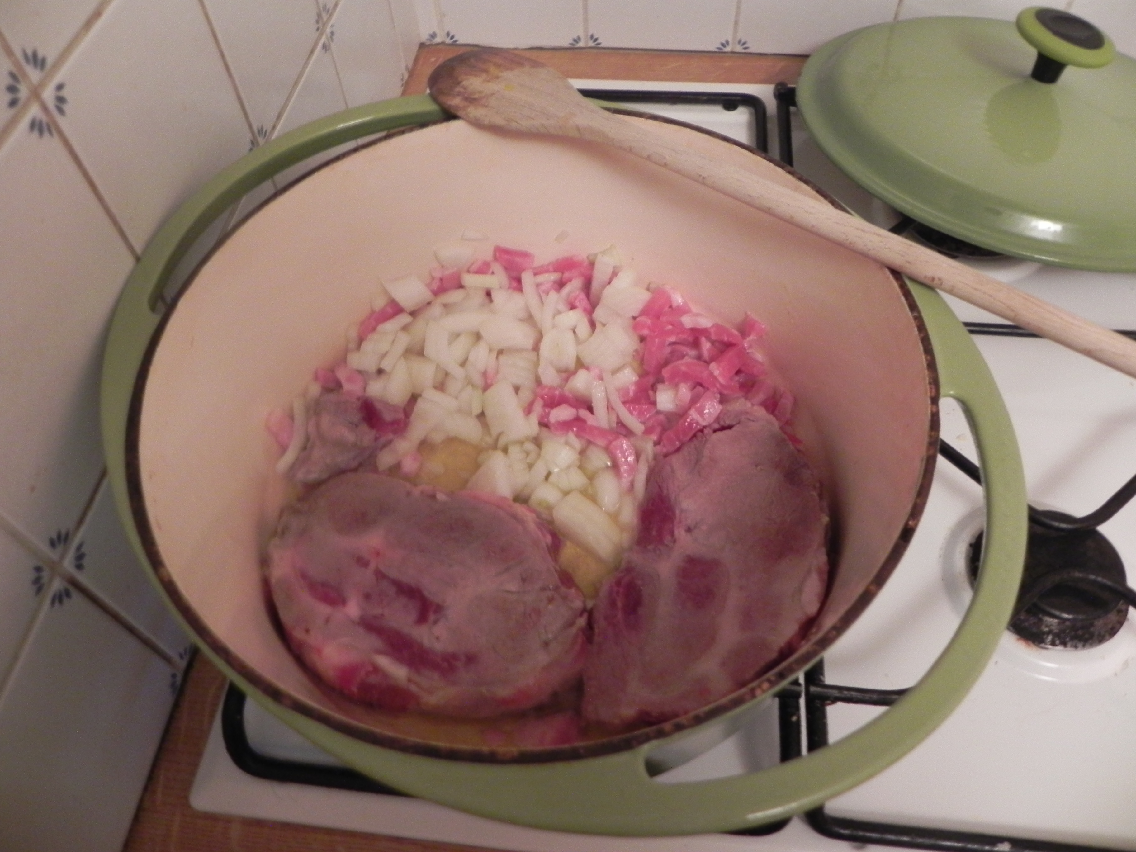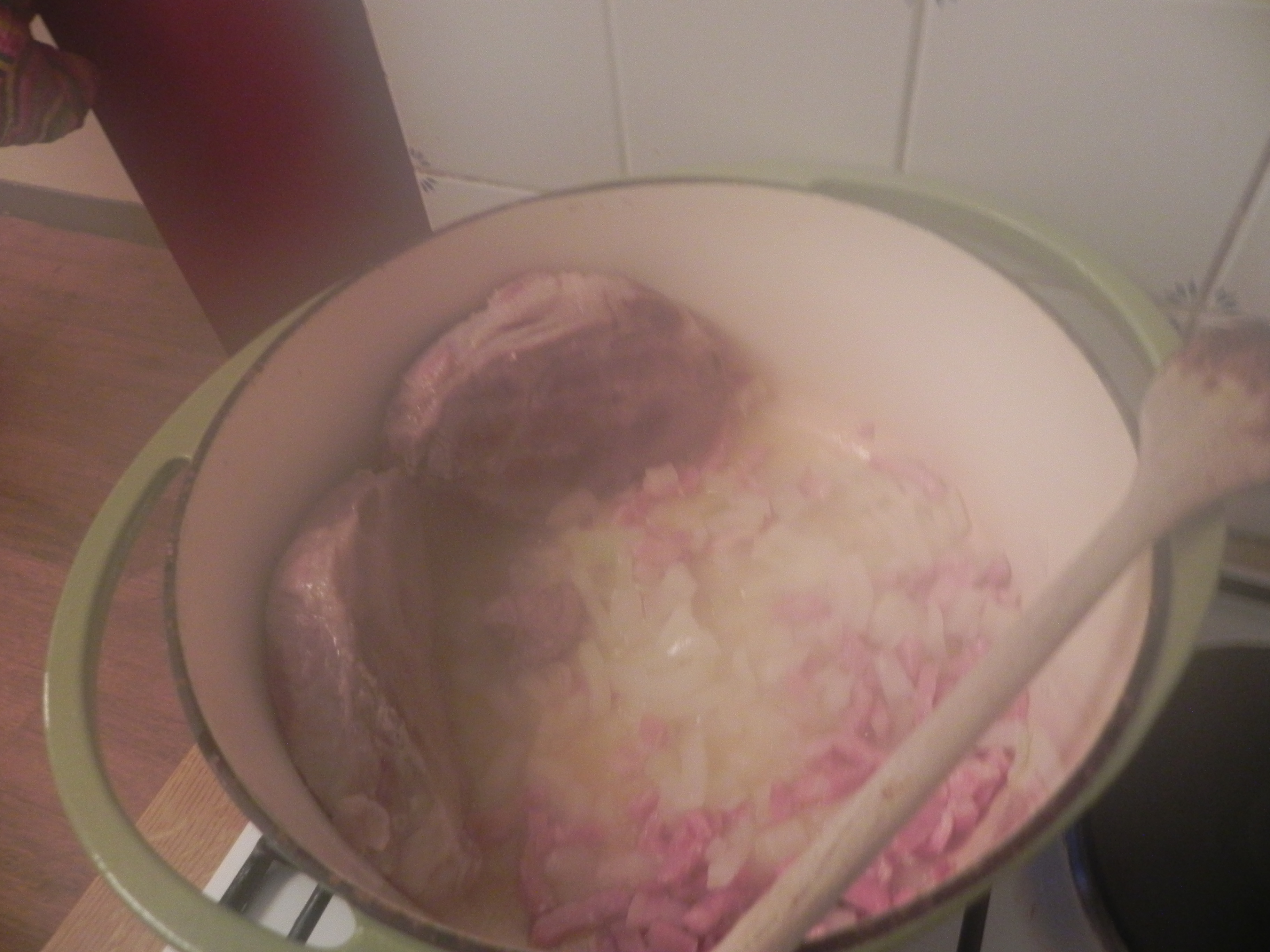 alors pour se faire je fais revenir 2 bonnes tranches d'échine de porc, des lardons et des oignons;