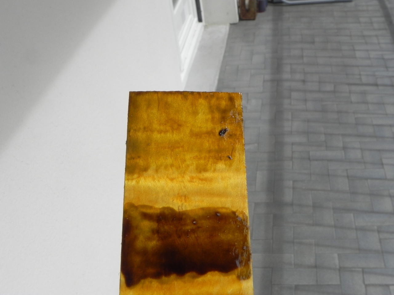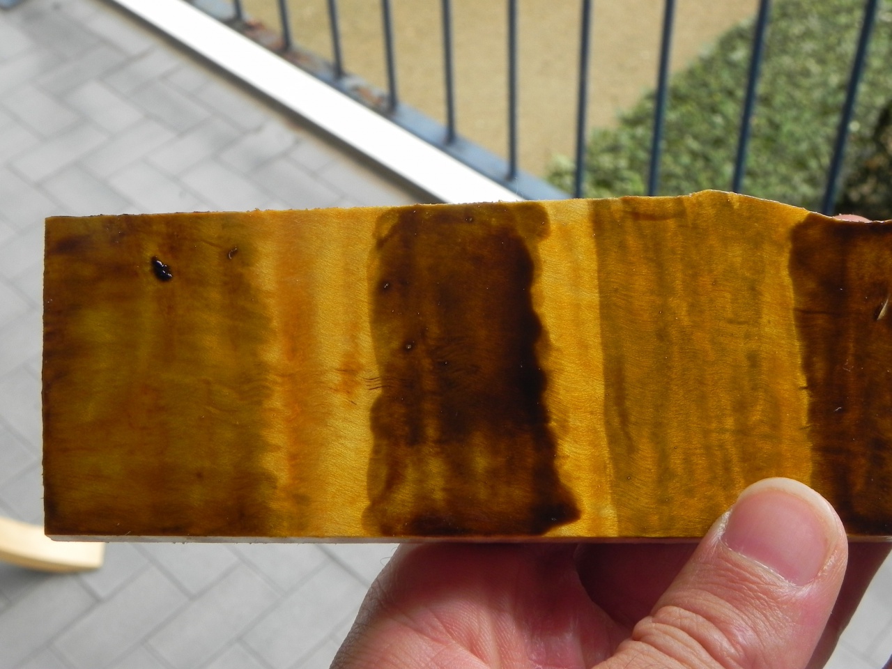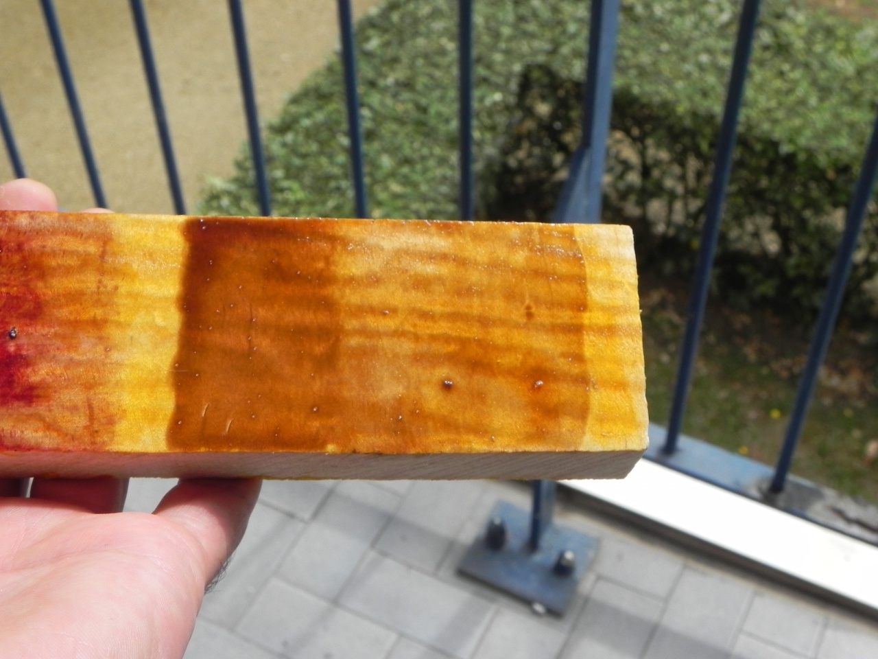 j'ai profité de ces derniers jours pour faire quelques tests (encore...) et franchement le vernis c'est dur, bon je me suis pas facilité la tache en choisissant des anilines plutôt que des liquid stain mais bon, qui peut le plus peut le moins comme on dit... c'est rien de bien transcendant car tests effectués au pinceau et non au gun mais encore une fois c'est juste pour avoir une idée des couleurs donc :