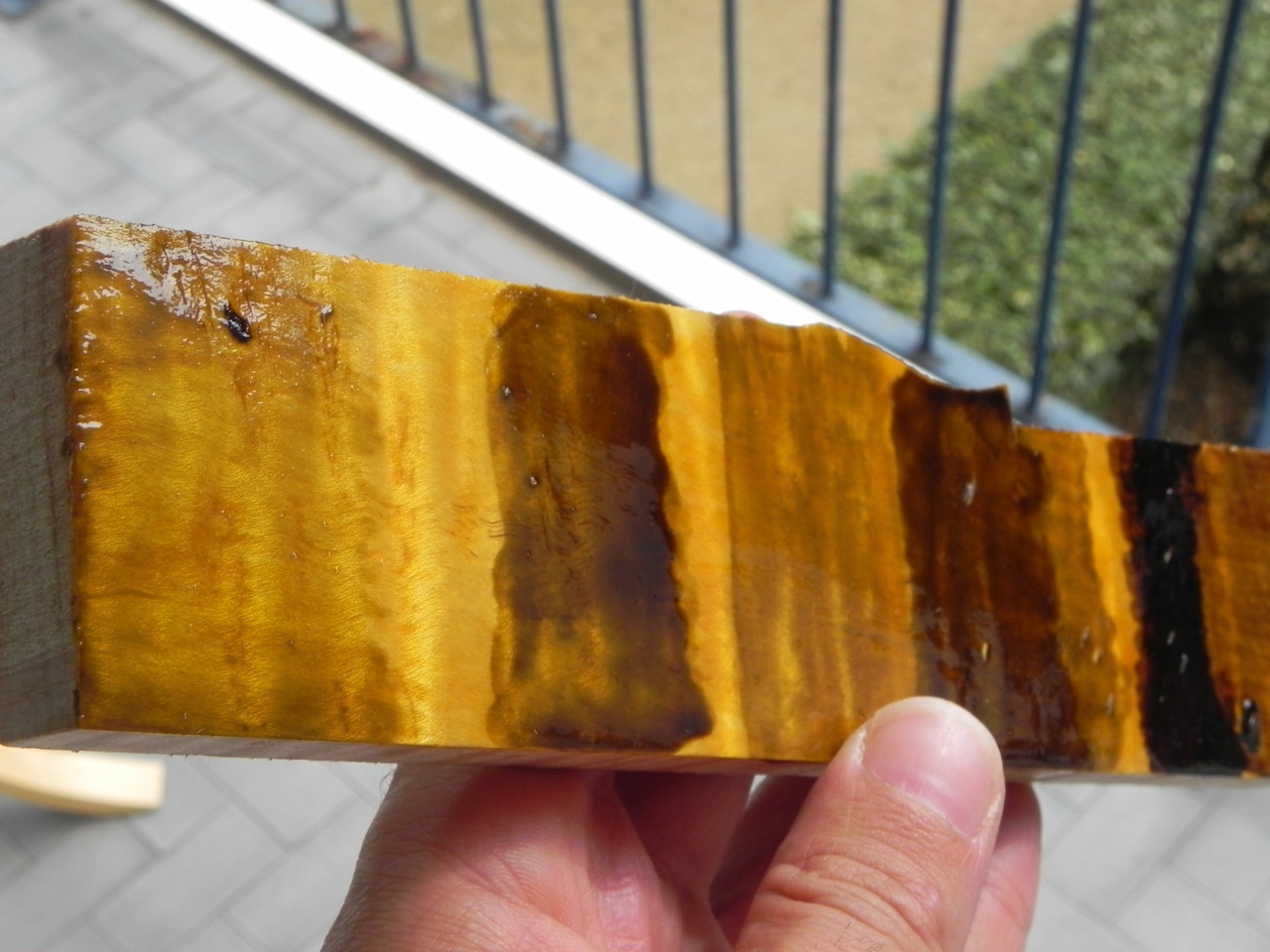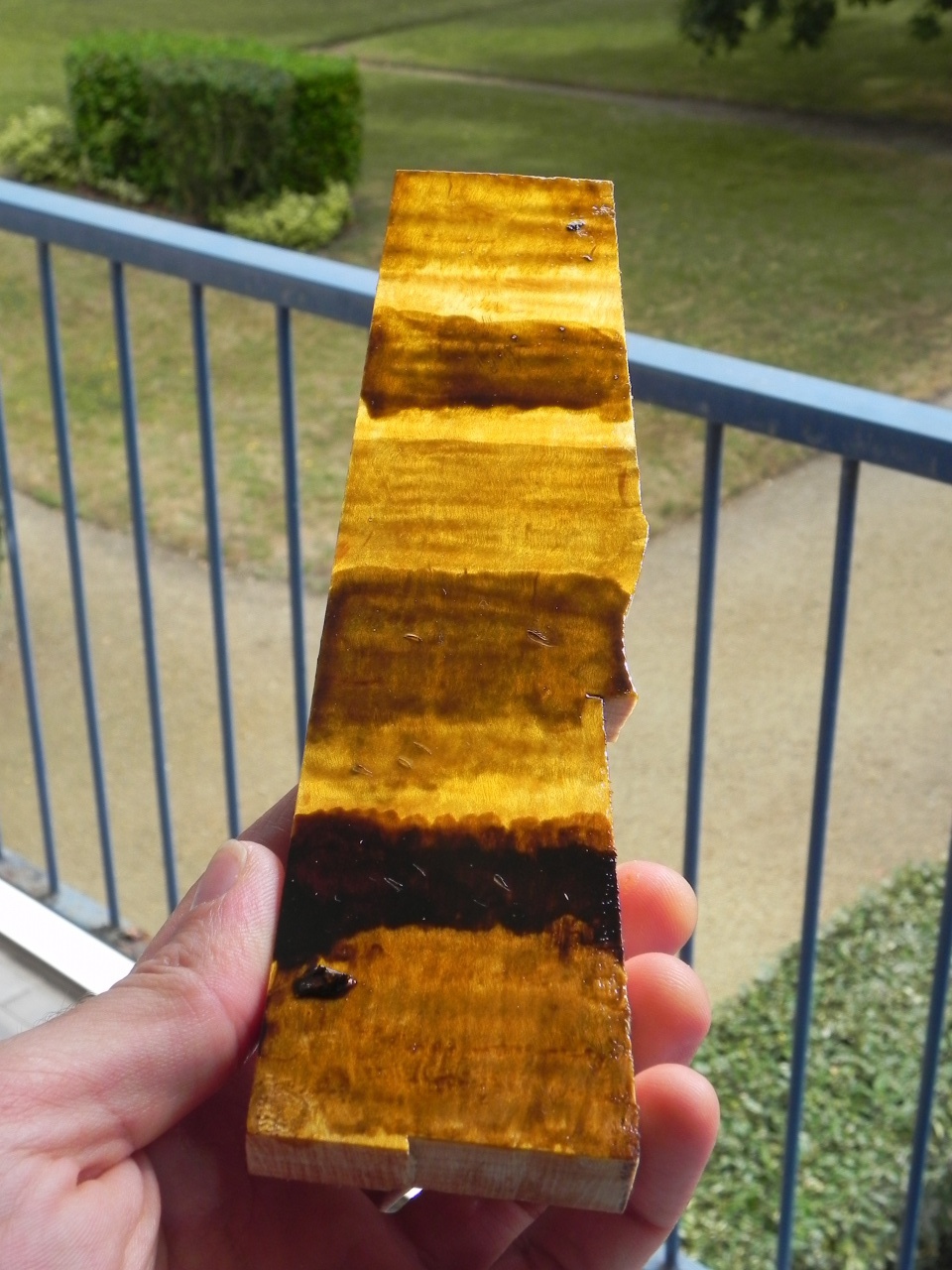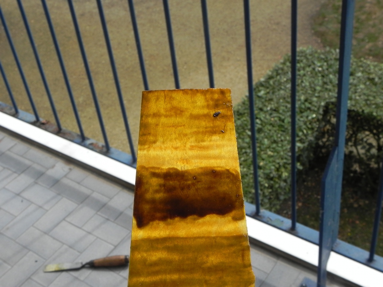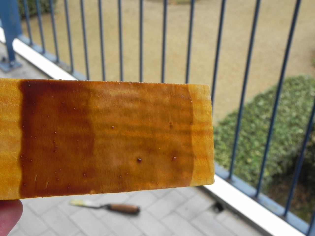 j'ai profité de ces derniers jours pour faire quelques tests (encore...) et franchement le vernis c'est dur, bon je me suis pas facilité la tache en choisissant des anilines plutôt que des liquid stain mais bon, qui peut le plus peut le moins comme on dit... c'est rien de bien transcendant car tests effectués au pinceau et non au gun mais encore une fois c'est juste pour avoir une idée des couleurs donc :