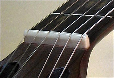 Concernant le sillet, il est loin d'être taillé dans les règles de l'art (faudrait virer une bonne épaisseur sur le dessus, les cordes ne doivent d'enfoncer au maximum que de leur propre hauteur)