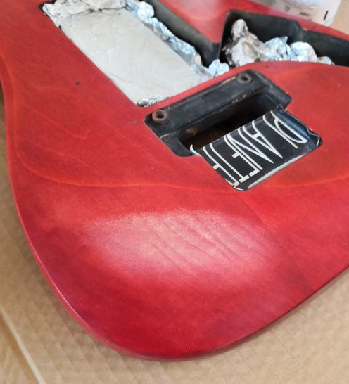 Originellement, cette guitare était laquée noire. Je l'ai poncée jusqu'à l'os pour la teinter (stewmac) et ai commencé un première couche de vernis bombe.