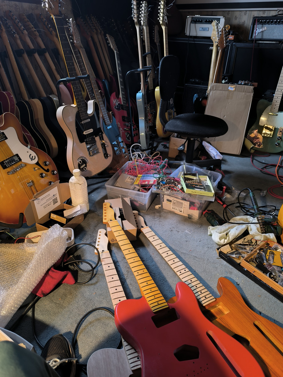 J ai repris les sillets , ajusté les frettes coupantes , refais les circuits base tone rider dont cts et sprague orange , treble bled , en micros des Alexander pribora , fender tex mex ,roswell .