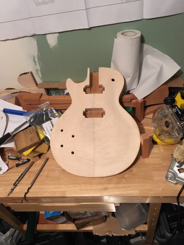 Défonce du truss rod channel. J'ai utilisé ma Dremel et son support avec une fraise de 3/16 de pouces (diamètre du truss rod). J'aurais dû avoir le manche "brut" sur les côtés, afin d'avoir un rectangle parfait qui m'aurait permis d'utiliser le côté comme guide pour la défonce du truss rod channel.
