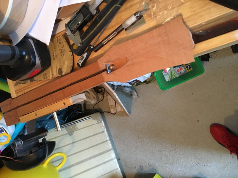 Le truss rod channel doit faire 1/2 pouce de profondeur côté tête et 5/8 côté tenon. Ca lui permet de bosser en compression. J'ai utilisé l'étau de devant de mon établi pour positionner le manche affleuré côté tenon et 1/8 de pouce plus bas que la table côté tête, afin de me servir de la surface de la table comme guide (on commence à 5/8 côté tenon et on finit à 4/8 donc 1/2 côté tête).