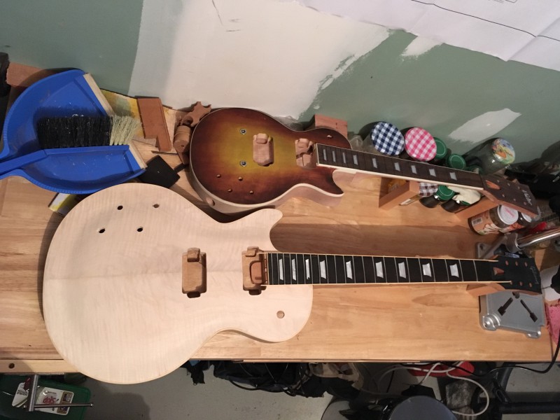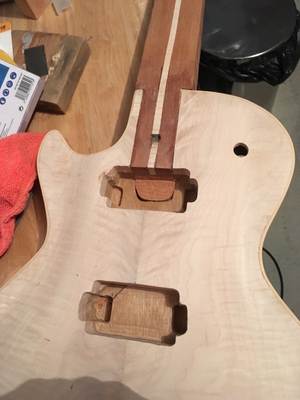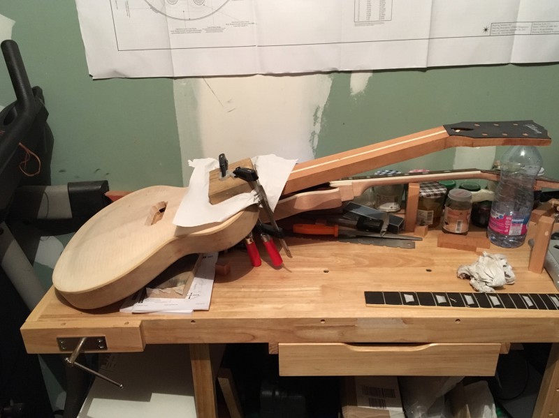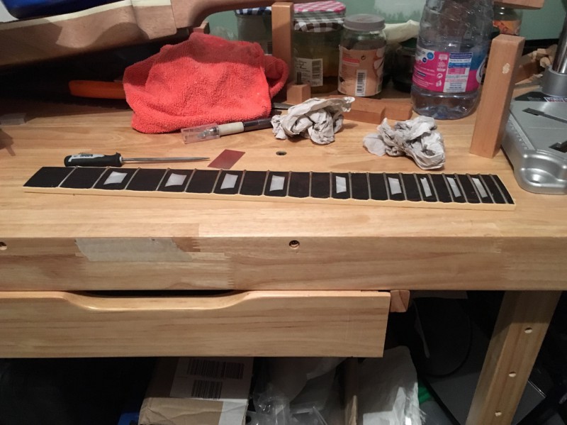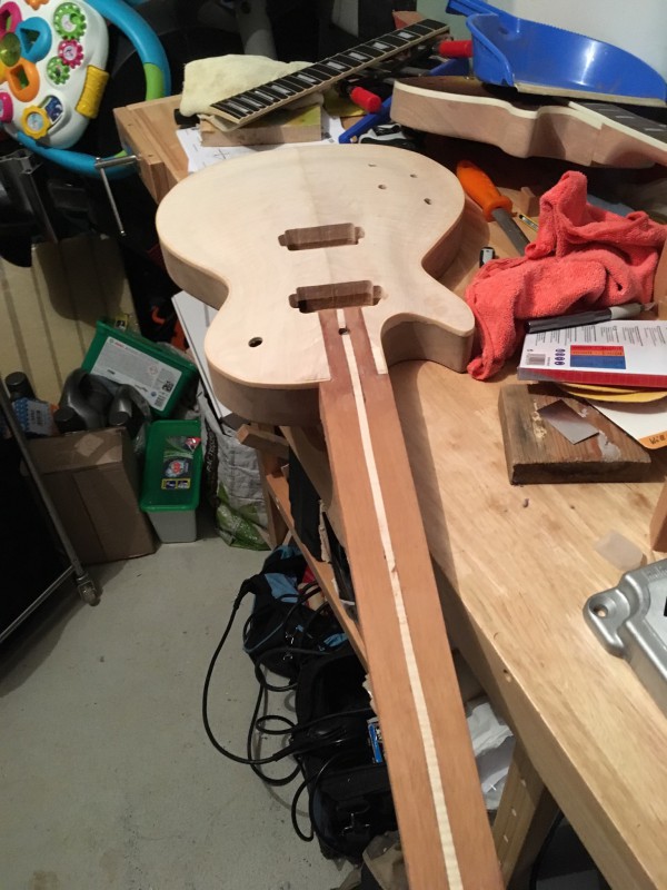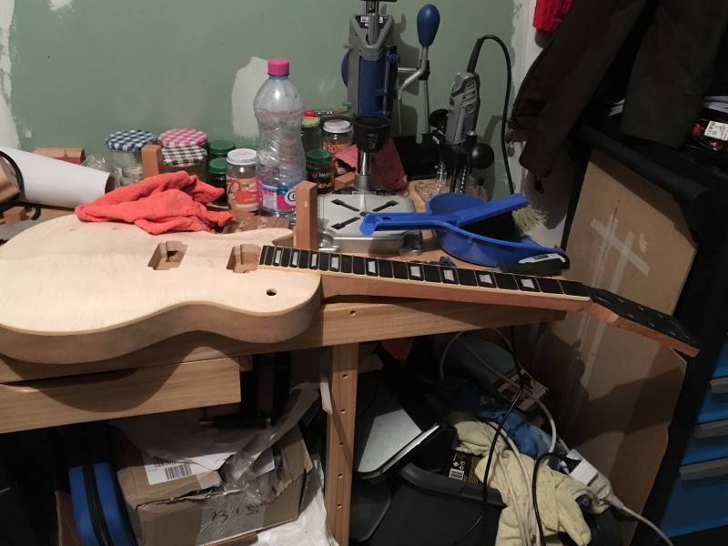 Et, comme j’allais pas rester comme ça, et que j’etais aussi chaud que cette traînée de Hide Glue (en moins puant je crois), bah j’ai collé la touche après avoir refait la planéité du neck pocket :