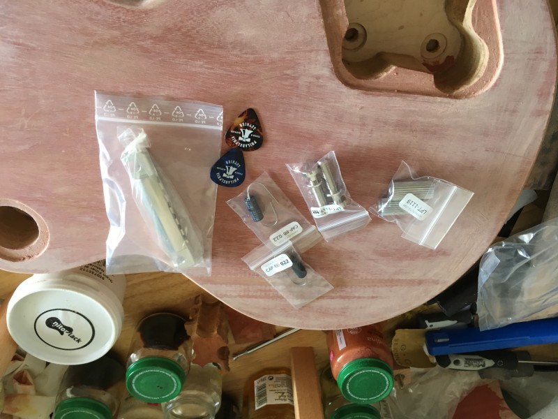 J'attends encore mes inserts longs vintage acier, mes studs vintage longs acier de chez Philadelphia Luthier pour mon cordier alu de chez Crazyparts (en attente de livraison également), mes condos PIO black bee de chez Philadelphia Luthier, et mon chevalet AVR2 TonePros (en cours de livraison également).