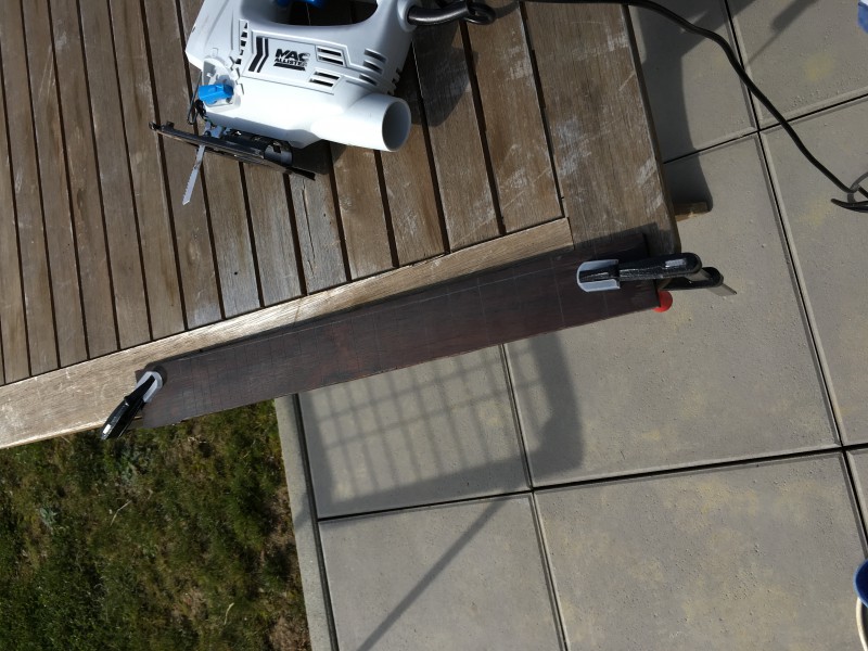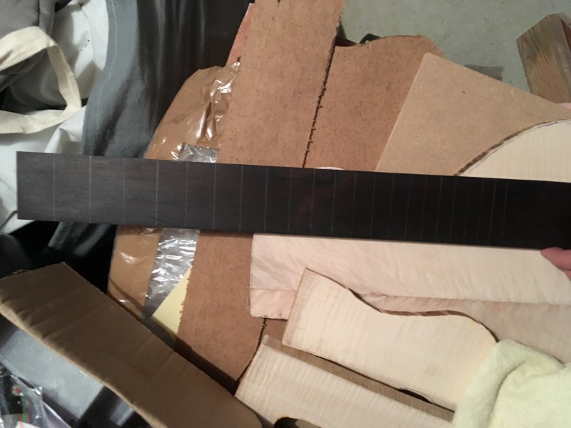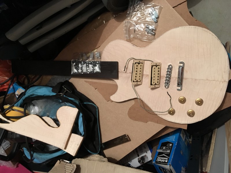 Le corps et le manche reviennent la semaine prochaine, je fais mettre le corps à 4,5 cm plat (le plateau d’acajou était à 5,4 un peu cintré) et détourer le corps et le manche.
